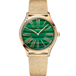For this model, the slim 36 mm case is crafted in 18K Moonshine™ gold and features 38 full-cut diamonds, which curve elegantly along each side. The domed malachite dial includes applied and domed Roman numerals and diamond-polished hands all in 18K Moonshine™ gold, while the crown is engraved with an OMEGA flower, filled with red liquid ceramic and set with a single diamond.