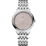 In this 34 mm stainless steel model, the PVD rose-grey sandy dial features a crystal finish. The display is distinguished by PVD Sedna™ Gold coloured hands, as well as alternating Roman numerals and cabochon indexes.