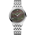 In this 34 mm stainless steel model, the dial is crafted from stunning Tahiti mother-of-pearl. The display is distinguished by rhodium-plated hands, as well as alternating Roman numerals and cabochon indexes.