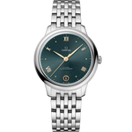 In this 34 mm stainless steel model, the PVD pine green dial features a sun-brushed finish. The display is distinguished by yellow gold-plated hands, as well as alternating Roman numerals and cabochon indexes.