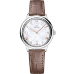 This watch is presented on a shimmering taupe brown leather strap and is driven by the OMEGA Quartz Calibre 4061, with a battery life of at least 48 months.