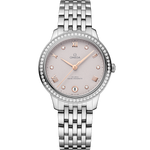 This 34 mm stainless steel model features a diamond-paved bezel and a PVD rose-grey sandy dial with a crystal finish. The display is distinguished by PVD Sedna™ Gold coloured hands, as well as alternating Roman numerals and diamond markers that are set in 18K Sedna™ Gold holders.