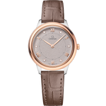 This watch is presented on a shimmering taupe brown leather strap and is driven by the OMEGA Quartz Calibre 4061, with a battery life of at least 48 months.