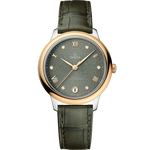 In this 34 mm stainless steel - 18K yellow gold model, the PVD matcha green dial features a stamped random vertical pattern in a sun-brushed finish. The display is distinguished by yellow gold-plated hands, as well as alternating Roman numerals and diamond markers.