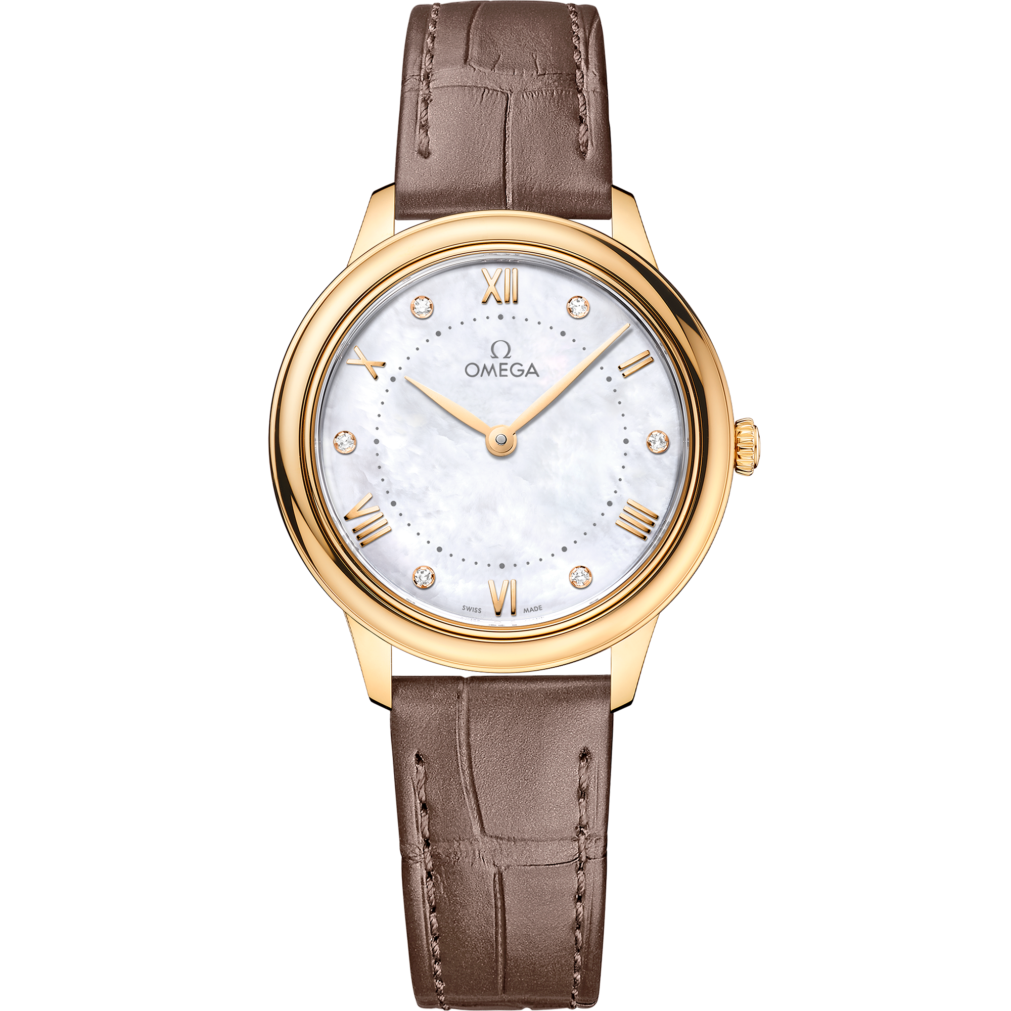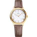 This watch is presented on a shimmering taupe brown leather strap and is driven by the OMEGA Quartz Calibre 4061, with a battery life of at least 48 months.