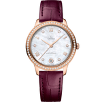 This Master Chronometer certified watch is presented on a shimmering burgundy leather strap and is driven by the OMEGA Master Co-Axial Calibre 8800, which can be admired through the scratch-resistant sapphire crystal caseback.