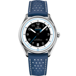 This 39.5 mm model has a stainless steel case and a blue, micro-perforated leather strap. The domed black and white dial includes sporty hands, a date window and an easy-to-read minute track, as well as a blue pulse reader that enables the wearer to calculate their pulse beats-per-minute.
