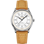The set includes this 39.5 mm model, created with a stainless steel case and a yellow micro-perforated leather strap. The white domed dial of each watch, which includes an easily readable railway minute track and contrasting blackened hands. There is also a yellow pulse reader on each dial that enables 20-second timing intervals of the wearer’s pulse.