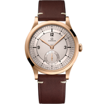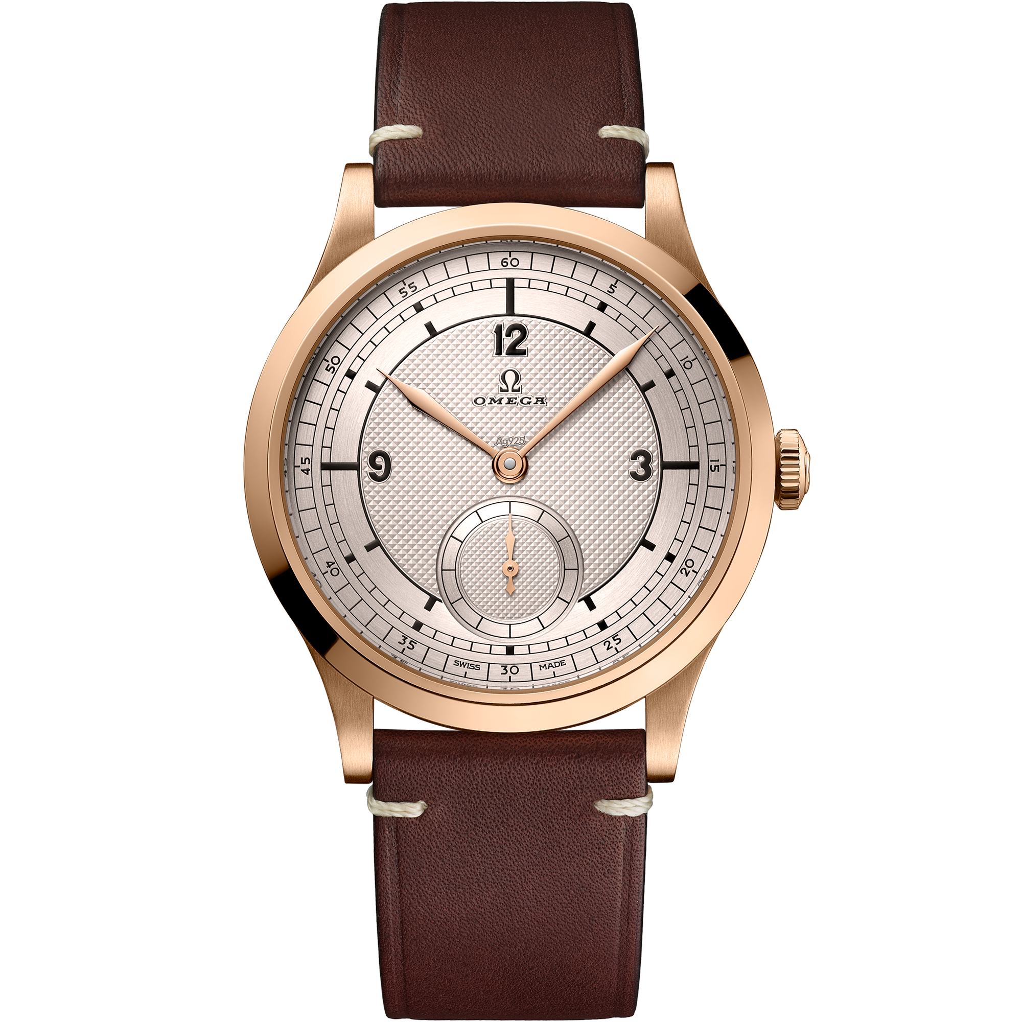 The 39 mm brushed case is crafted in OMEGA’s exclusive Bronze Gold, with a polished bezel, and a vintage OMEGA logo embossed on the crown. Behind the domed sapphire crystal, the dial is made from Ag 925 silver, with a “Clous de Paris” pattern at the center and a small seconds subdial at 6 o'clock. In even finer detail, there is a circular brushed pattern on the minute track and subdial minute track, as well as a dark grey vintage OMEGA logo. The 18K Sedna™ Gold hands have been given a special PVD Bronze Gold coating.