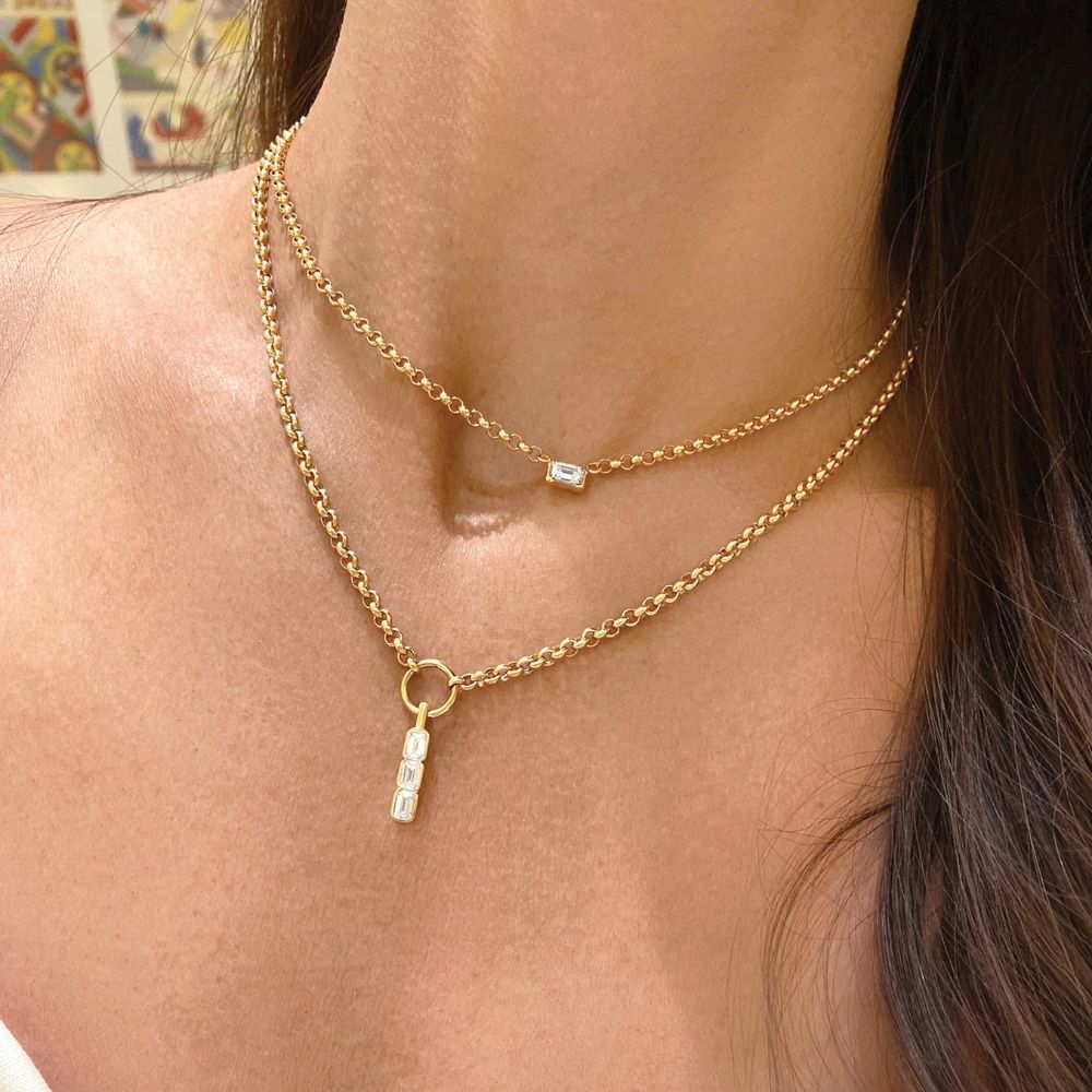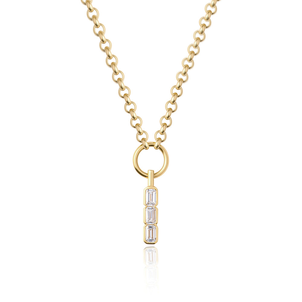 Our Three Stone Emerald Cuddle necklace showcases the beauty of emerald diamonds. Crafted from fine 18k yellow gold, this necklace features a pendant that elegantly cradles three GIA certified Diamonds. The seamless embrace of gold creates a stunning silhouette, merging the diamonds into a mesmerizing display. It's the perfect everyday accessory to elevate your style.