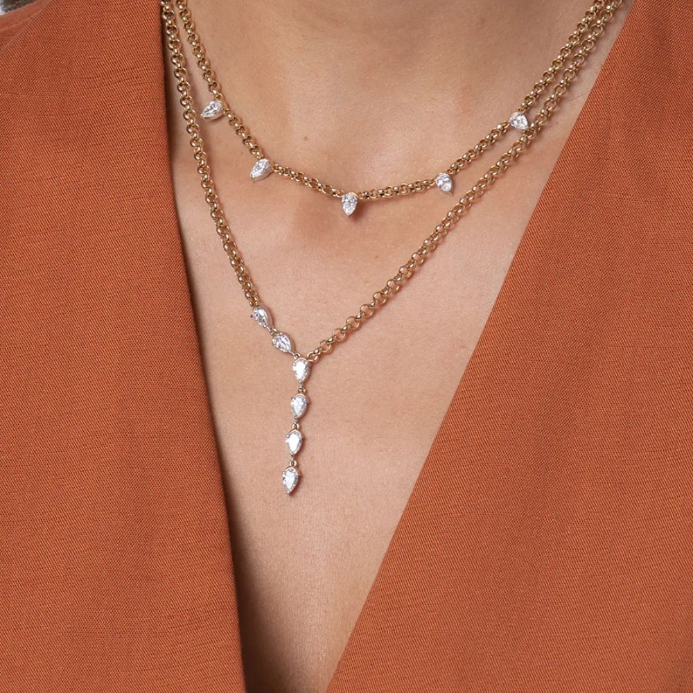 Five dazzling pear-shaped diamonds gracefully dangle along the chain. Each pear-shaped diamond comes with its own GIA certificate and colorless grading.