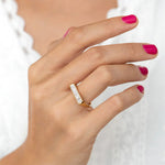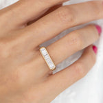 The sleek and minimalistic design of this ring showcases a channel of white baguette cut diamonds, creating a dynamic and light-bending composition that seamlessly combines rhythm and light with order and function. The fluid golden bezel envelops the diamond lineup, adding a touch of sophistication to this statement piece. Plus, you can wear it with confidence knowing that the diamonds are conflict-free, making it a responsible and stylish choice. . The carefully selected diamonds boast very good-excellent cut, VS clarity, and color E-G, ensuring a brilliant sparkle that catches the eye. With a total diamond carat weight of 0.5ct and a band width of 2.2mm, this ring is a timeless addition to any jewelry collection.