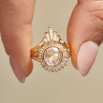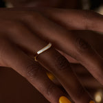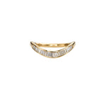 A refined accent with architectural charm. This curved wedding band features a seamless gradient of baguette and tapered baguette cut diamonds, elegantly set into a softly contoured 18k gold band. Designed to nestle beautifully against your engagement ring or shine on its own.