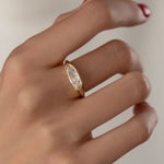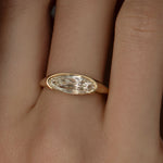 Sleek and unexpected, the Elongated Moval Solitaire is a minimalist statement with an edge. Handcrafted in 18K gold, this ring features a ~1.2ct elongated mixed-cut oval diamond, bezel-set with just enough gold to frame the stone without overwhelming it. An open space on one side of the setting introduces an architectural twist to this timeless silhouette.