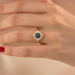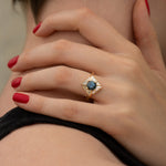 Evocative of a hidden oasis, this sculptural engagement ring centers around a ~1.5ct brilliant-cut teal sapphire—its vivid hue framed by a constellation of baguette and carré-cut white diamonds in a precise, geometric arrangement. The slightly asymmetric gold band and linear detailing create a composition that feels both architectural and organic.