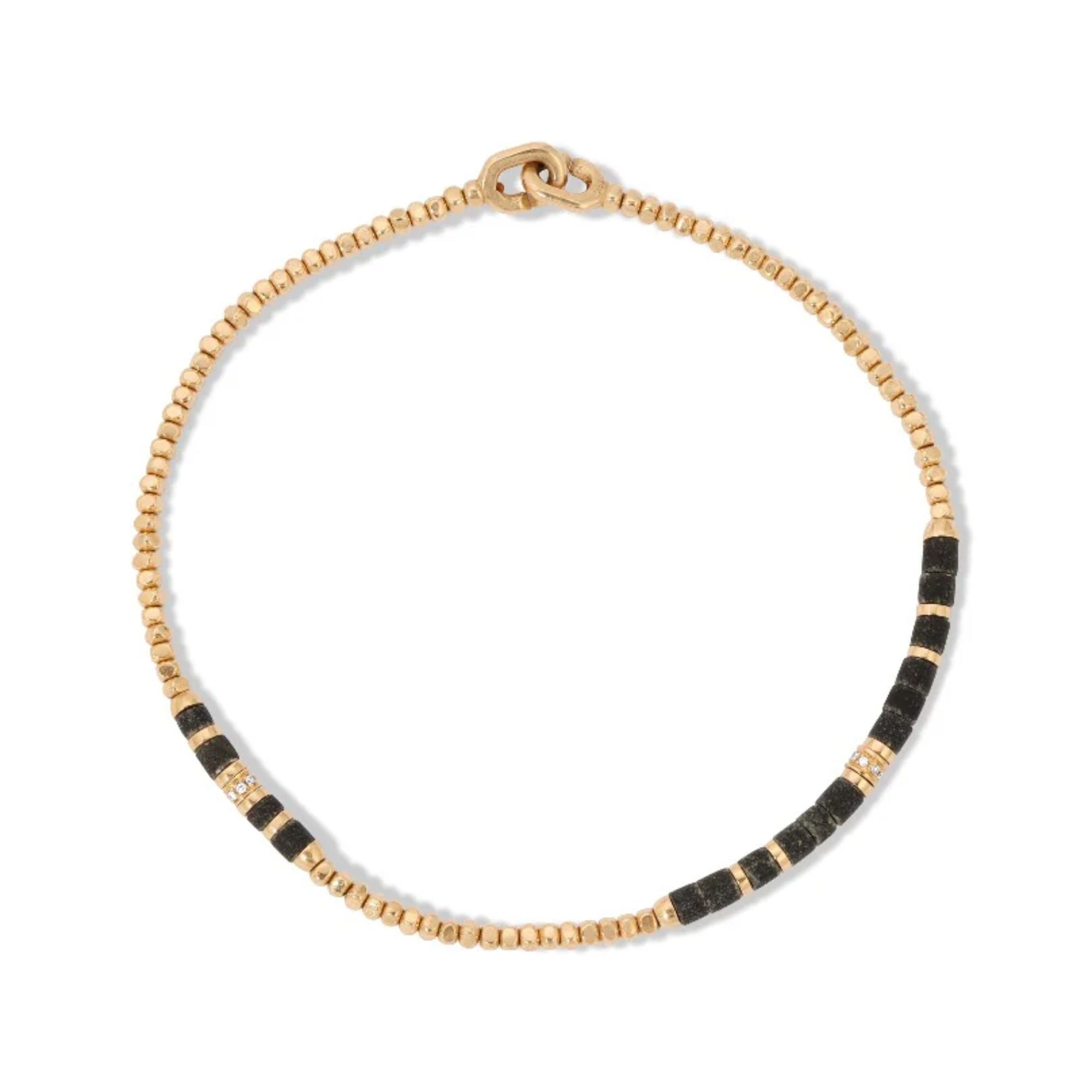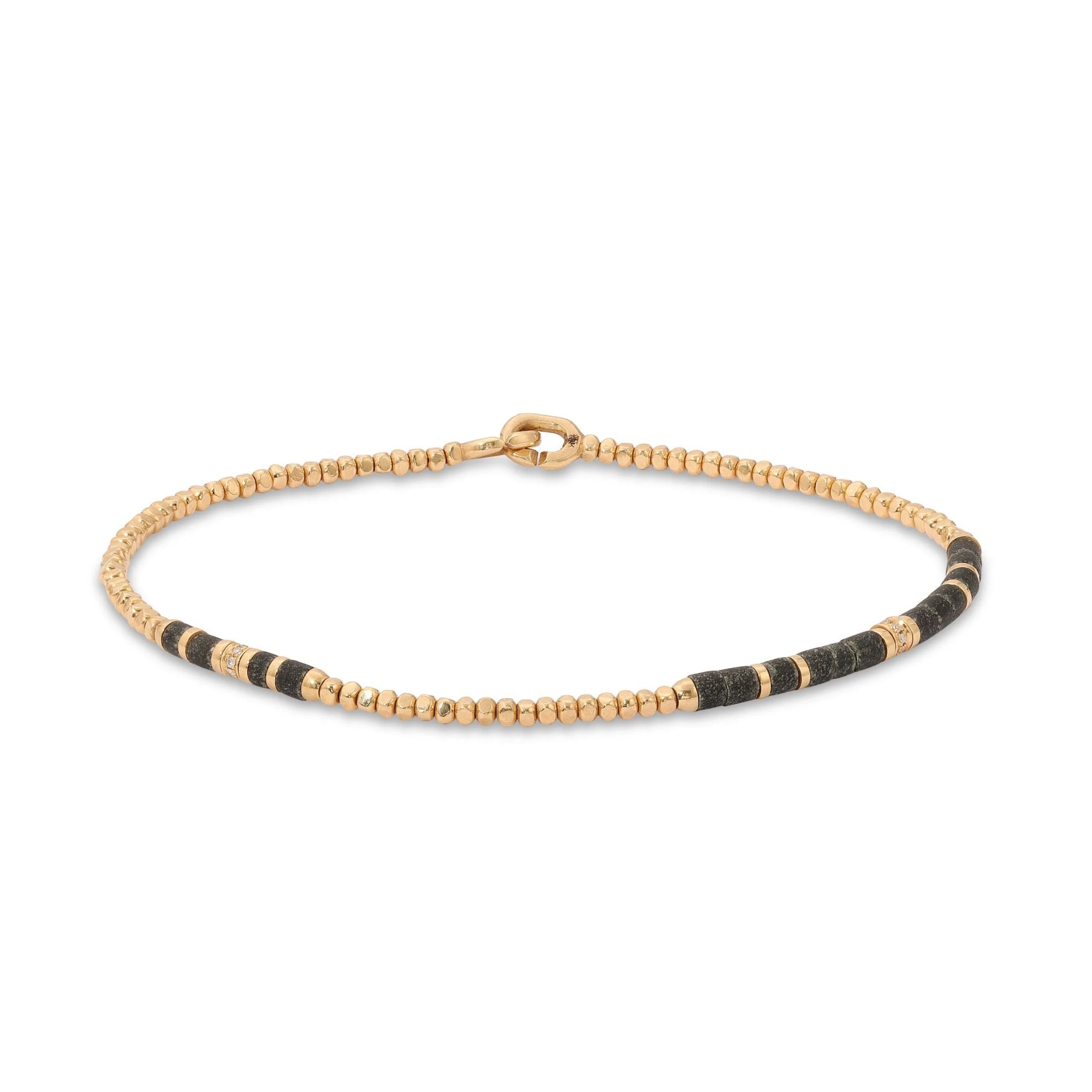 Strung with deep jade beads and accented by 18k yellow gold and pavé diamonds, the Creosote bracelet brings a refined mix of color and texture. Its balanced design adds understated richness to any stack while remaining striking enough to wear on its own.