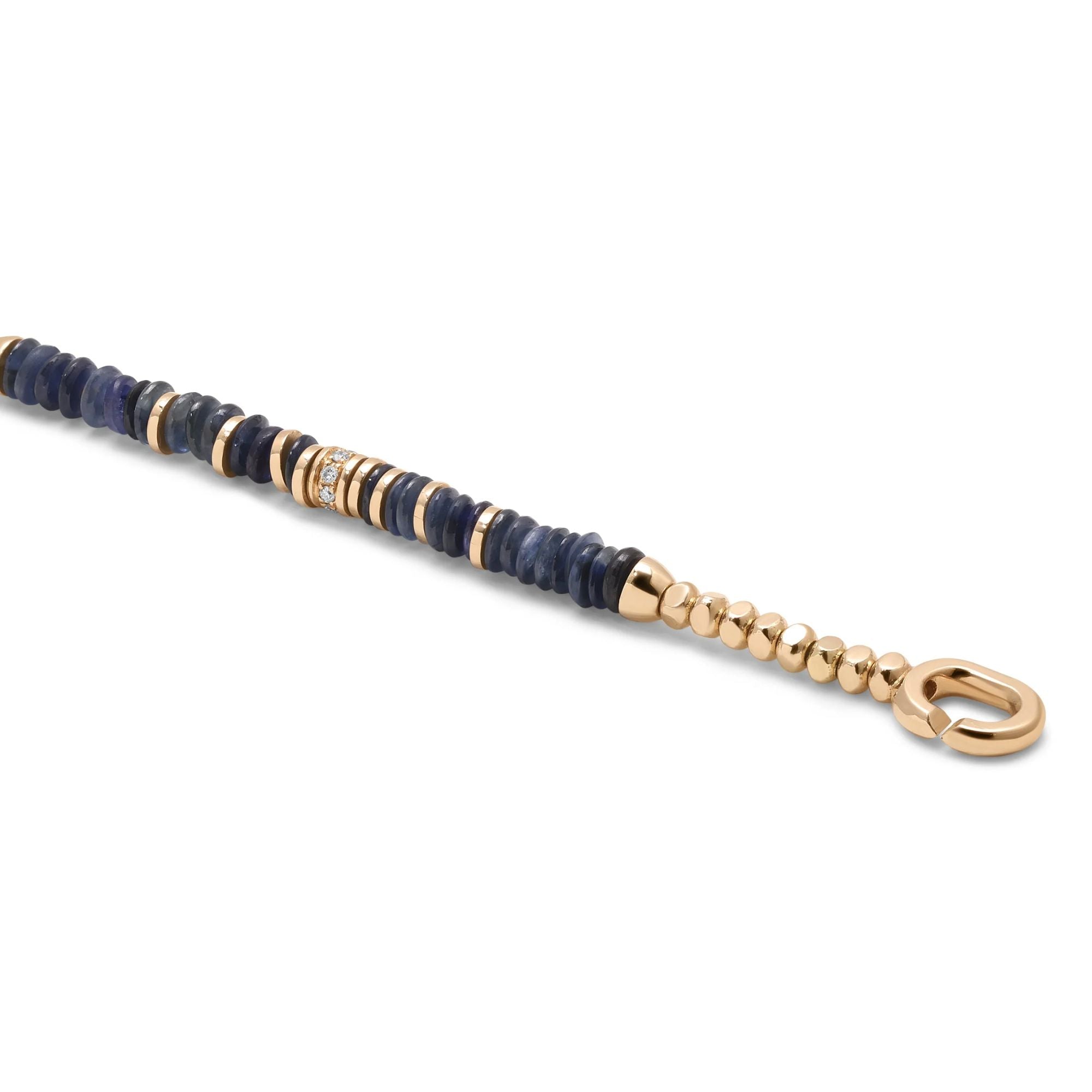 Crafted in 18k yellow gold, the Nell bracelet features 3.5 mm sapphire beads accented with pavé set white diamonds. The contrast of blue and sparkle creates a refined yet grounded look.