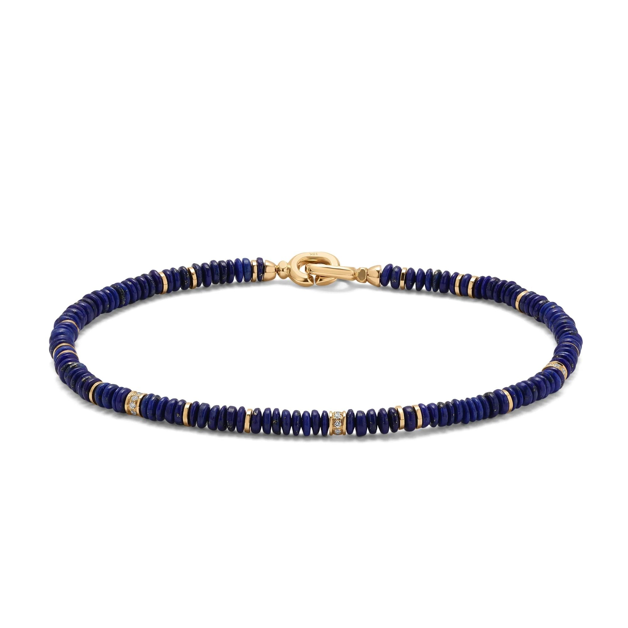 Crafted in 18K yellow gold and strung with polished lapis beads, this Shine Bracelet features pave diamond accents that catch the light beautifully. The contrast of deep blue and gold gives it a bold but elegant look—sophisticated enough to wear alone, but made for stacking too.