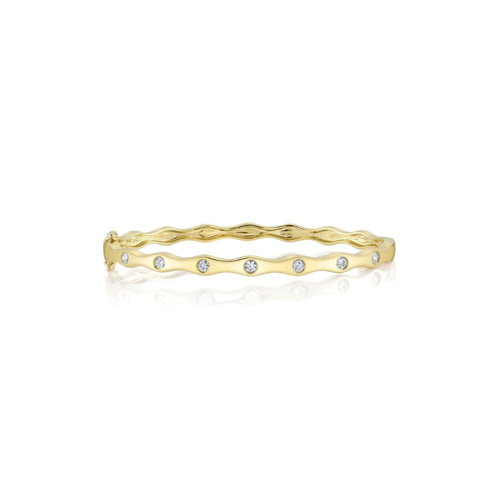A golden wave of elegance. This 14k yellow gold bangle sparkles with 0.45ct of bezel-set diamonds, gently flowing along its wavy shape. Chic on its own, stunning in a stack. It's the kind of piece you'll never want to take off.