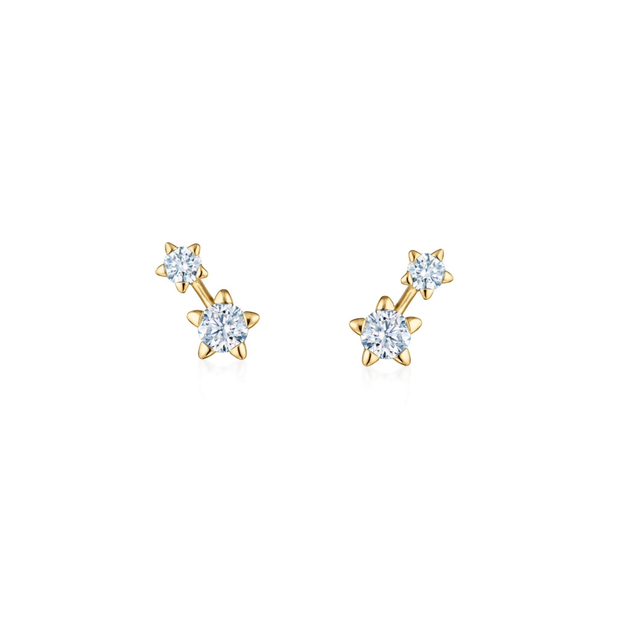 Two round brilliant diamonds in star-shaped settings seem to float against earlobes. Each stone is meticulously cut to the world’s highest standards for maximum beauty and brilliance and set in 18k gold.