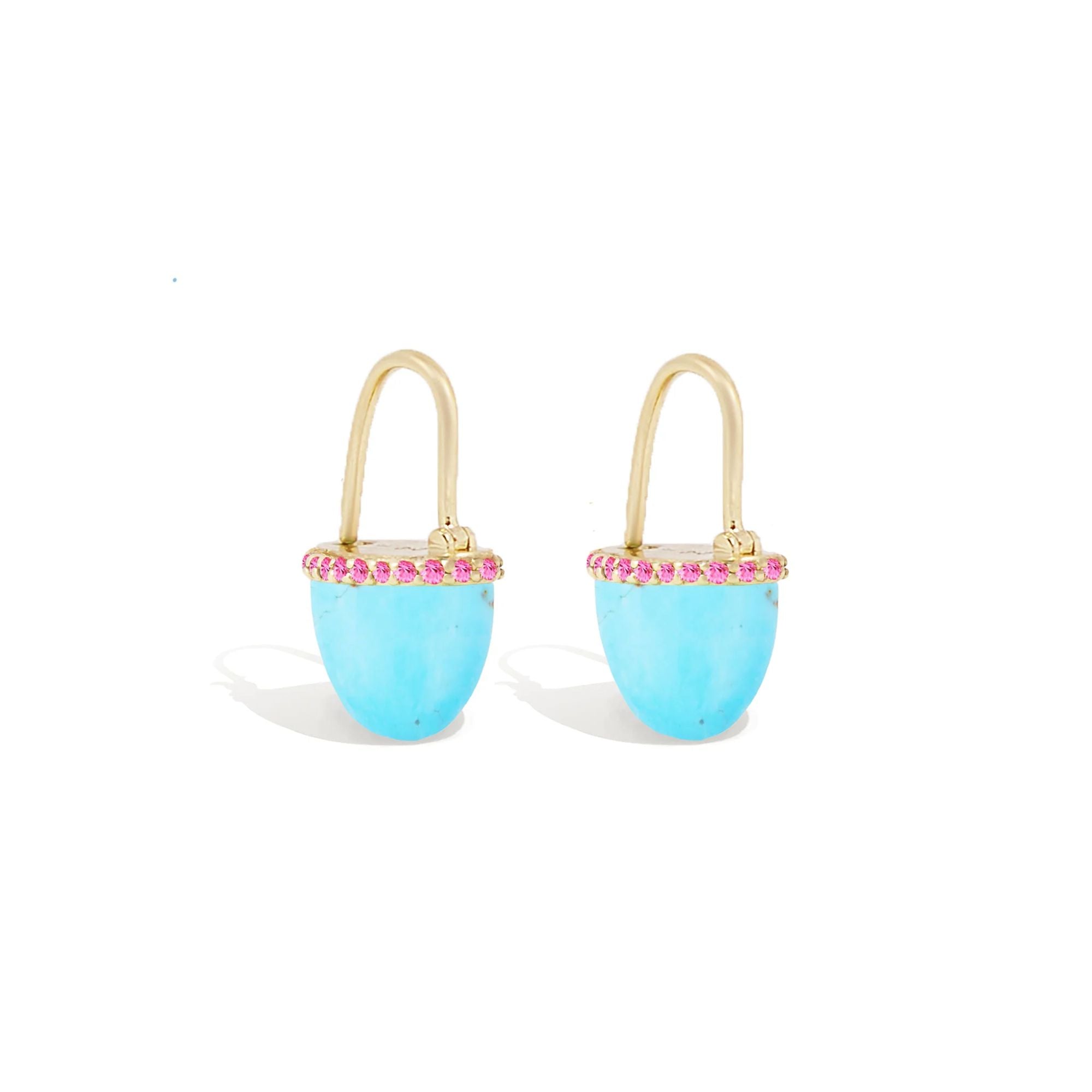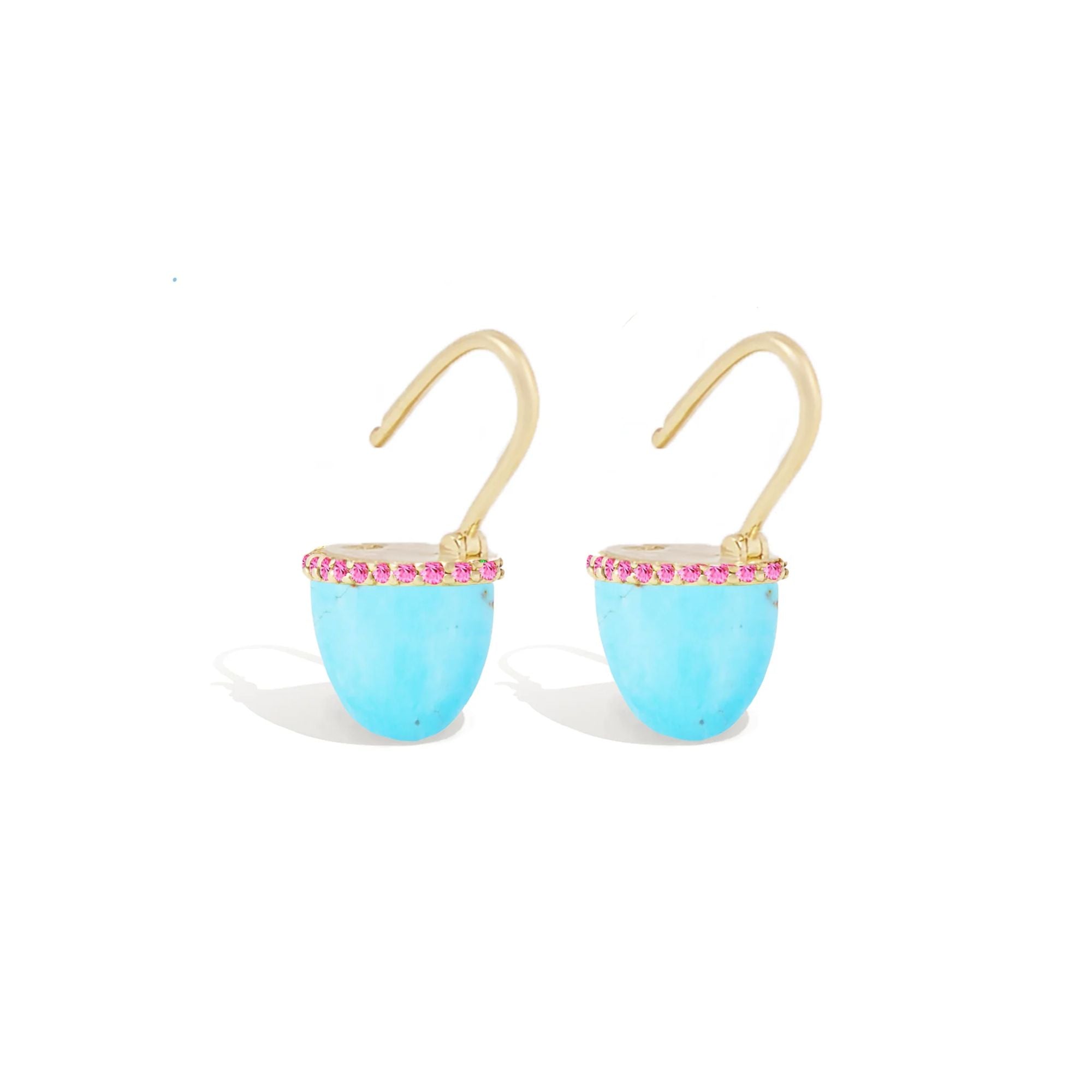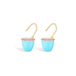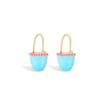 A unique alternative to a huggie style earring, these 14k gold Found Cap Huggie Earrings are effortless and fun to wear. Featuring shimmering turquoise, custom cut into a distinctive cap shape, and adorned by subtle pink sapphire details, these earrings will quickly become your go-to for everyday wear.
