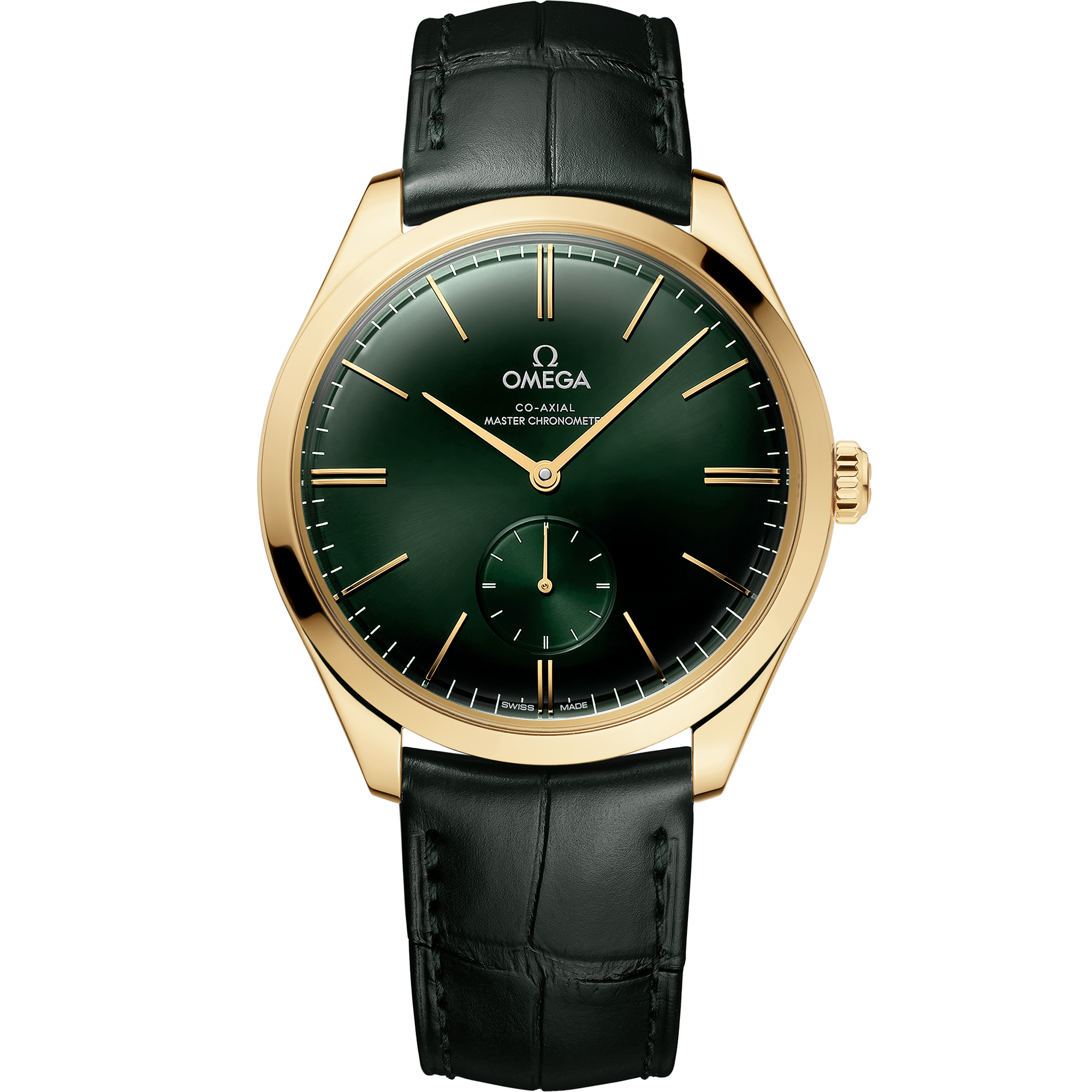 This model has a polished 40 mm 18K yellow gold case, which is presented on a green leather strap. The domed green dial includes a Small Seconds display at 6H, along with hands and domed indexes in 18K yellow gold.