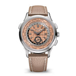 A combination of two emblematic Patek Philippe complications, this self-winding flyback chronograph World Time model in steel is distinguished by its sporty, vintage style. The opaline rose-gilt dial features a carbon-patterned center adding a modern, dynamic touch. The World Time function displays the time in 24 time zones simultaneously and whenever required.