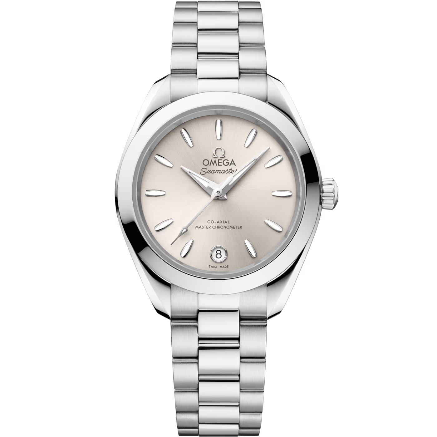 The watch is presented on an integrated stainless-steel bracelet with beautifully rounded polished-brushed links, a foldover butterfly clasp, and OMEGA’s easy comfort-adjustment system.
