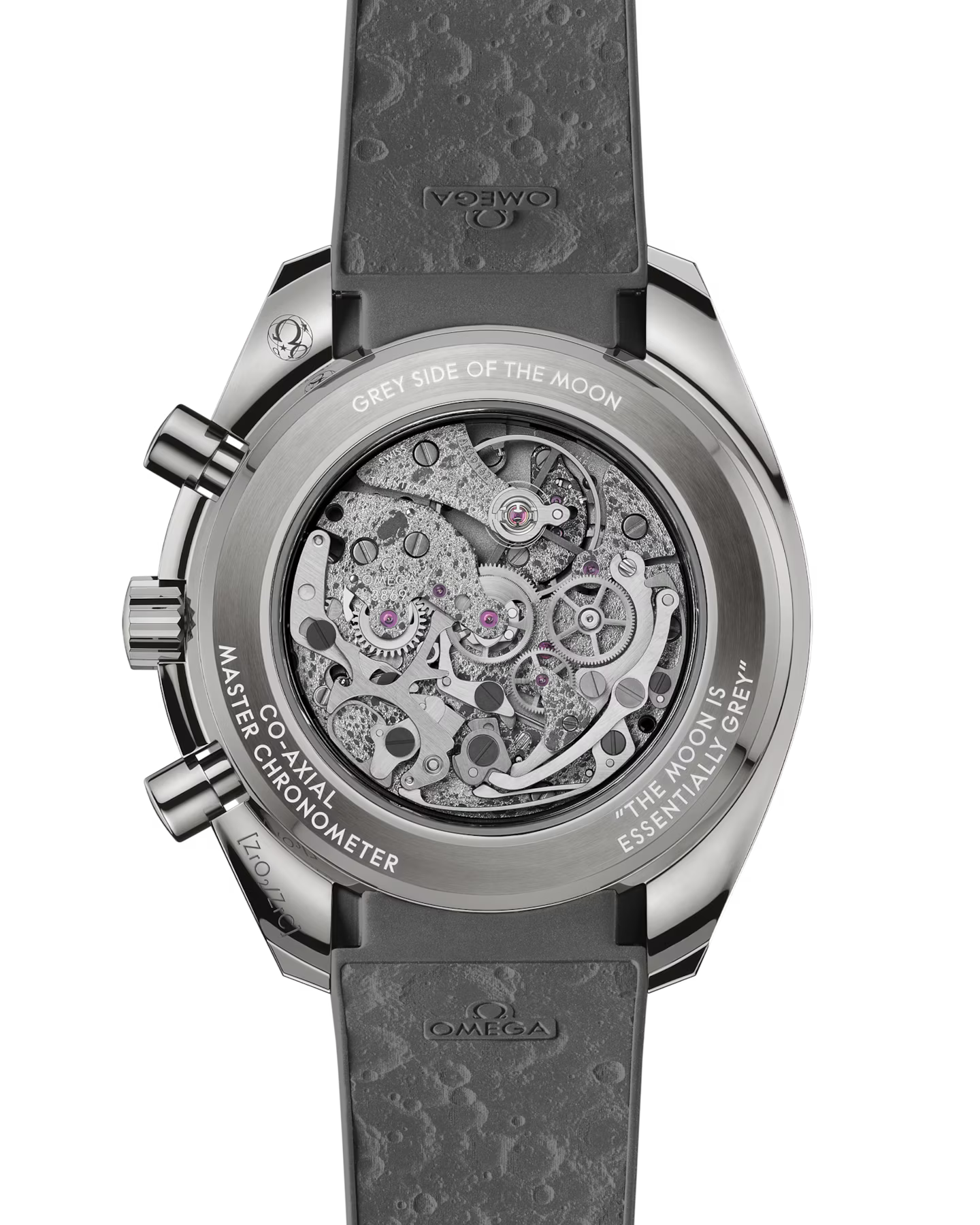 The specially decorated movement is the OMEGA Co-Axial Master Chronometer Calibre 3869, while the engravings on the caseback include the quote, THE MOON IS ESSENTIALLY GREY, which is attributed to Command Module Pilot, Jim Lovell, during the Apollo 8 mission.