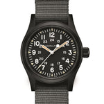 The black and gray color scheme of this Khaki Field Mechanical is a subtle approach to military styling. It is powered by the exclusive H-50 handwinding movement which is housed in a 38 mm case. Triangular indexes with old radium color Super-LumiNova? and a durable NATO strap complete the package.