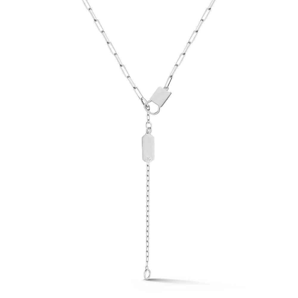This modern take on the classic gold lariat necklace features a soldered Betty Tag charm accented with a round brilliant-cut diamond on each side. Finished with a signature lock-inspired clasp and elongated rectangular links, it offers a fresh, contemporary update to a timeless style.