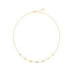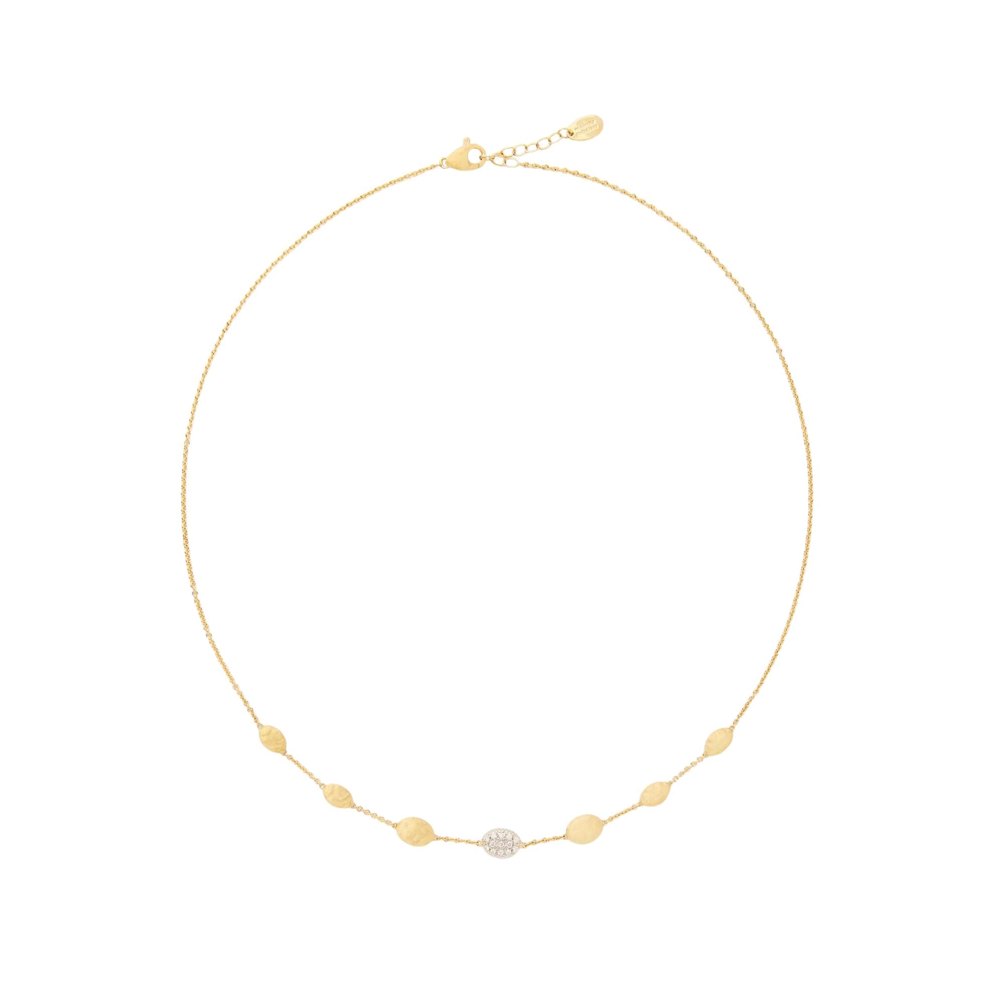 Handcrafted in Italy, this 18K yellow gold necklace from the Siviglia collection features sculptural oval stations and a single pavé diamond accent along a delicate chain. The brushed beads evoke irregular cobblestones winding through Seville's historic quarter, celebrating the art of imperfection. Inspired by light and shadow on textured surfaces, each station is hand-finished for organic beauty. Adjustable length layers beautifully or stands alone with refined elegance.