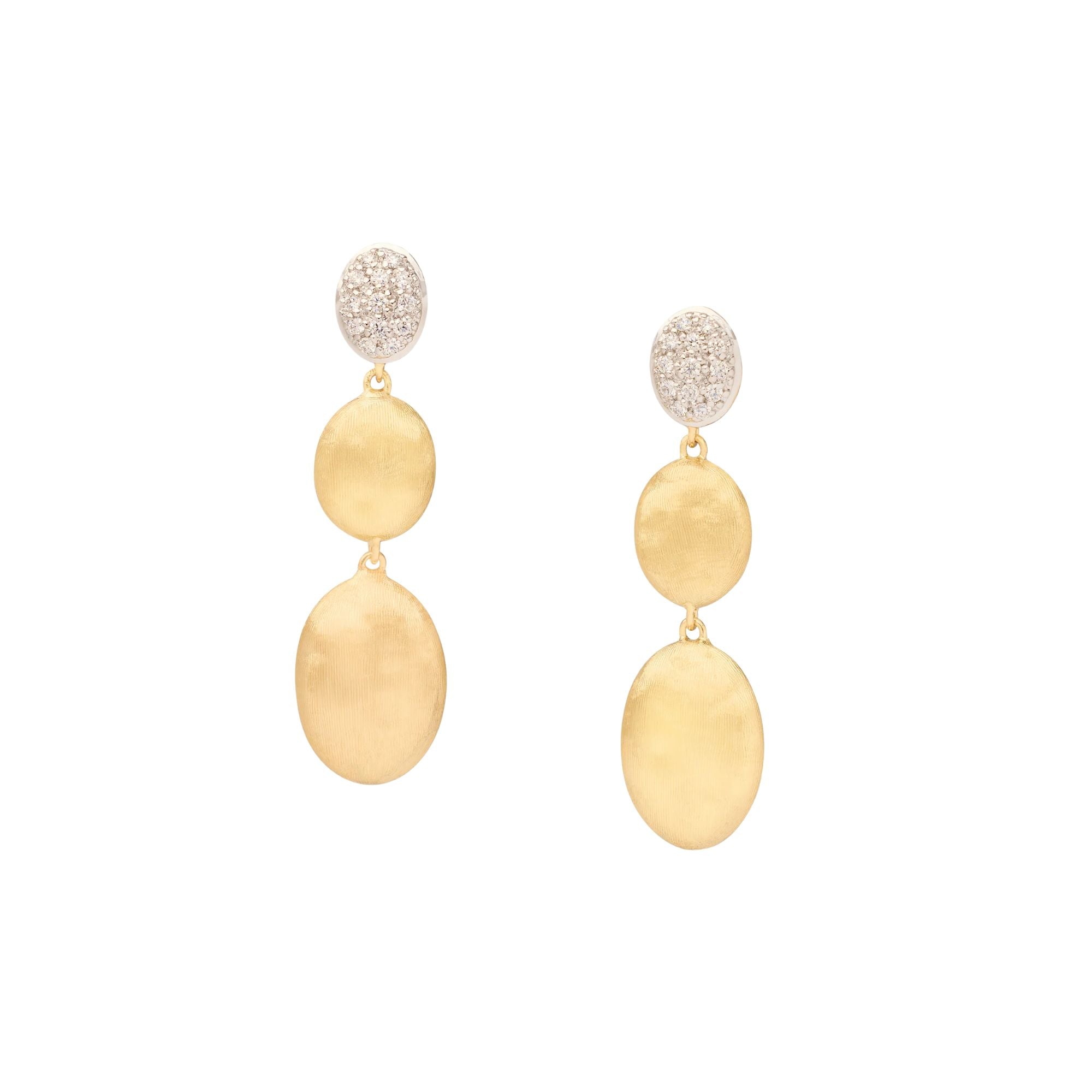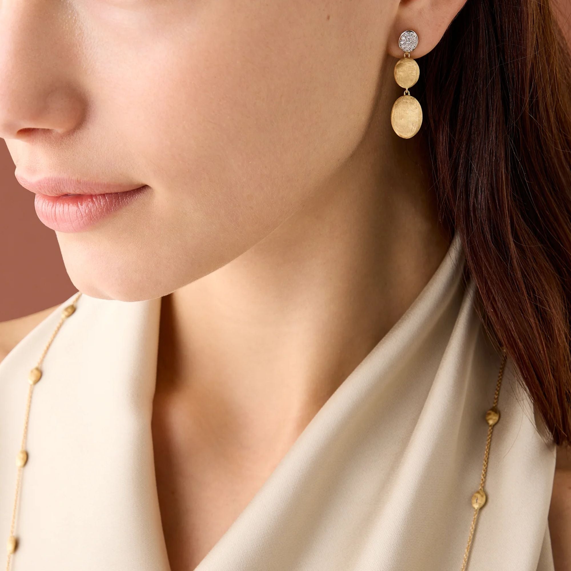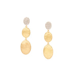 Handcrafted in Italy, these 18K yellow gold drop earrings from the Siviglia collection feature three graduating oval stations cascading from pavé diamond studs. The satin-brushed finish captures light beautifully, evoking the cobblestone streets winding through Seville's historic quarter. Each irregular, baroque-inspired form celebrates organic imperfection and the interplay of light and shadow. Lightweight and versatile, they transition effortlessly from day to evening.