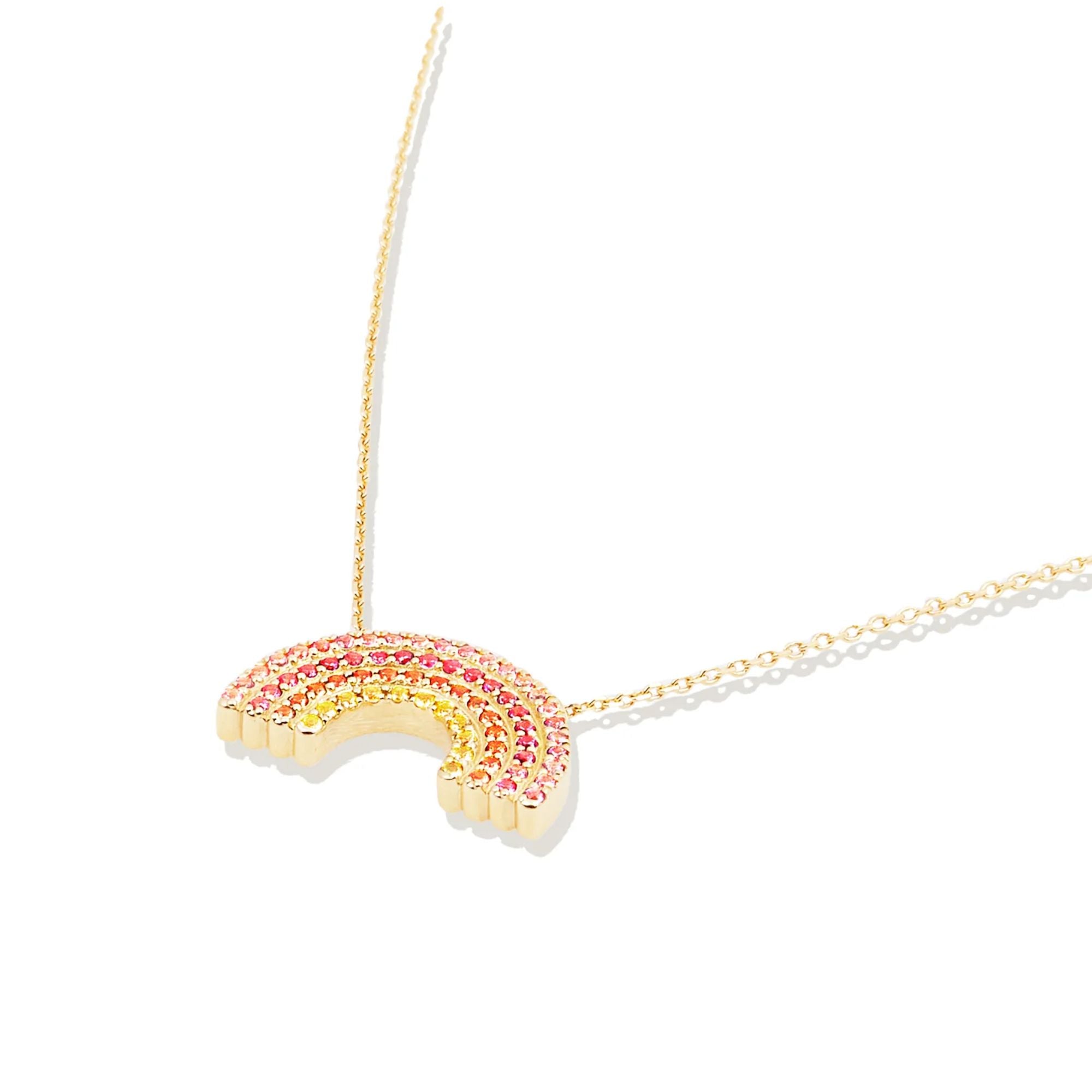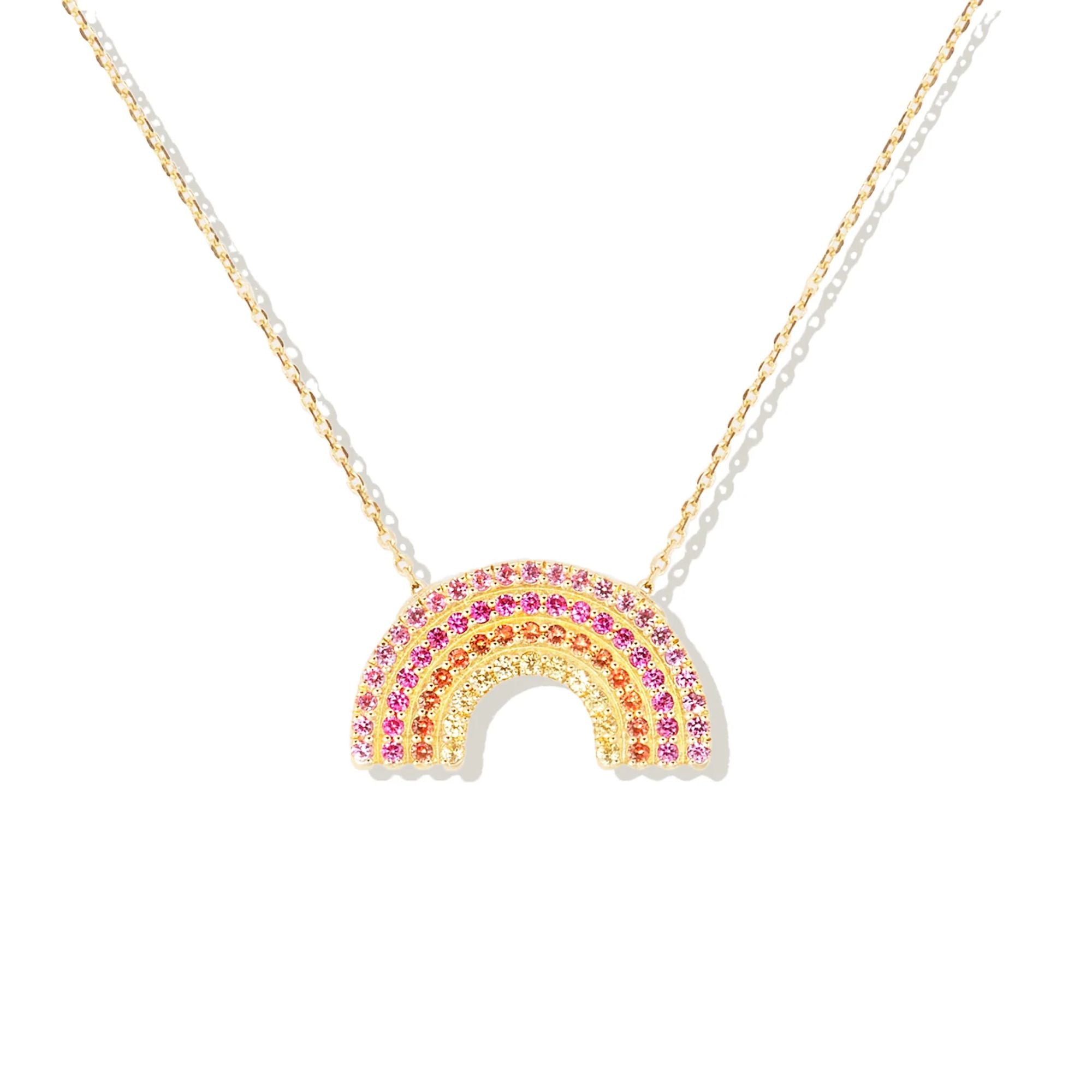 A nostalgic symbol that will never go out of style, the Juju Rainbow Charm Necklace is covered in pink, yellow, and orange sapphires. Hanging from a 14k gold diamond cut cable chain, and part of the highly collectible Juju Collection, each charm features signature ribbing detail and the same gold design on the back.