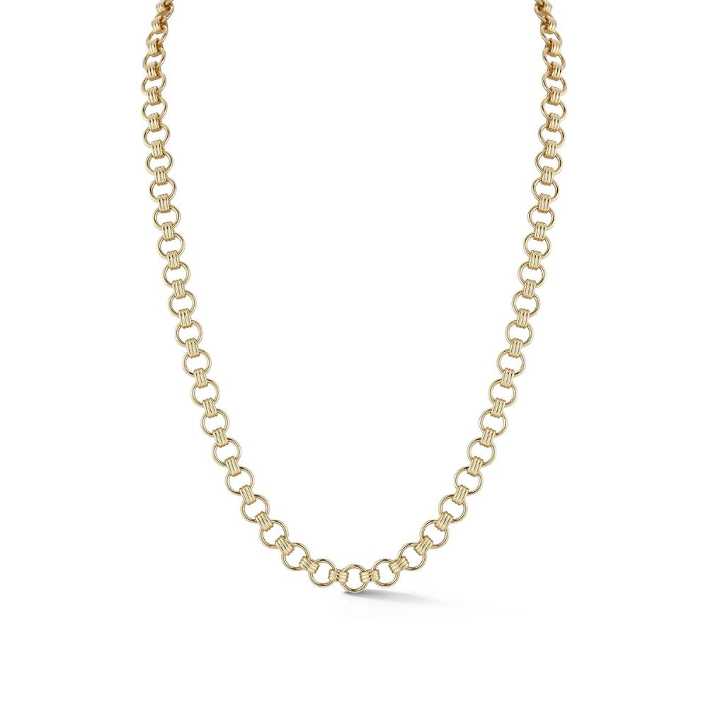 Striking the perfect balance between bold and timeless, the Everett Chain features handcrafted book links in 14k yellow gold. Its fluid silhouette lays beautifully on the neckline. A perfect way to anchor your favorite charms.