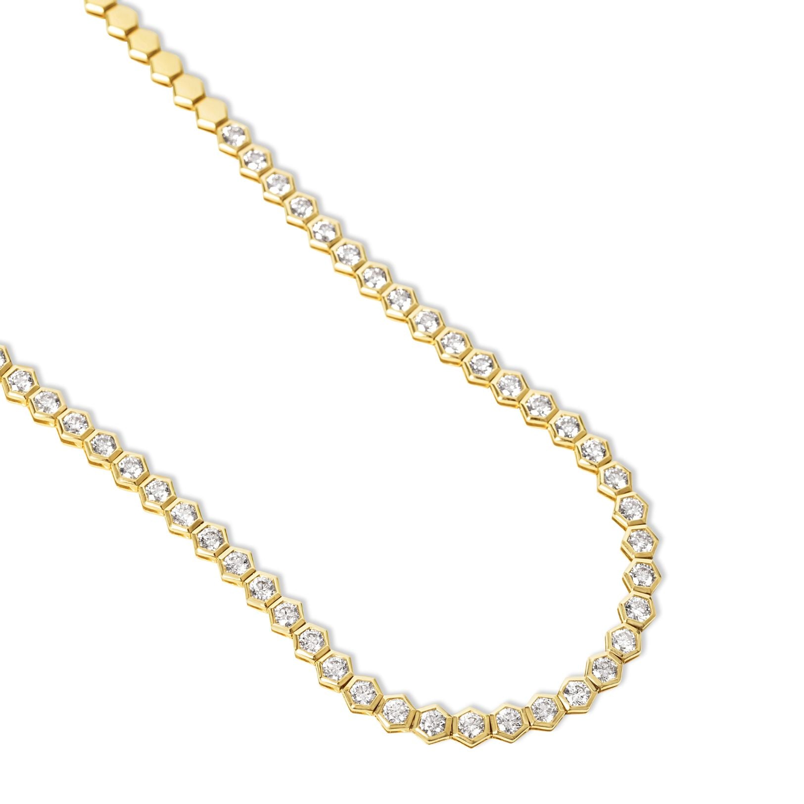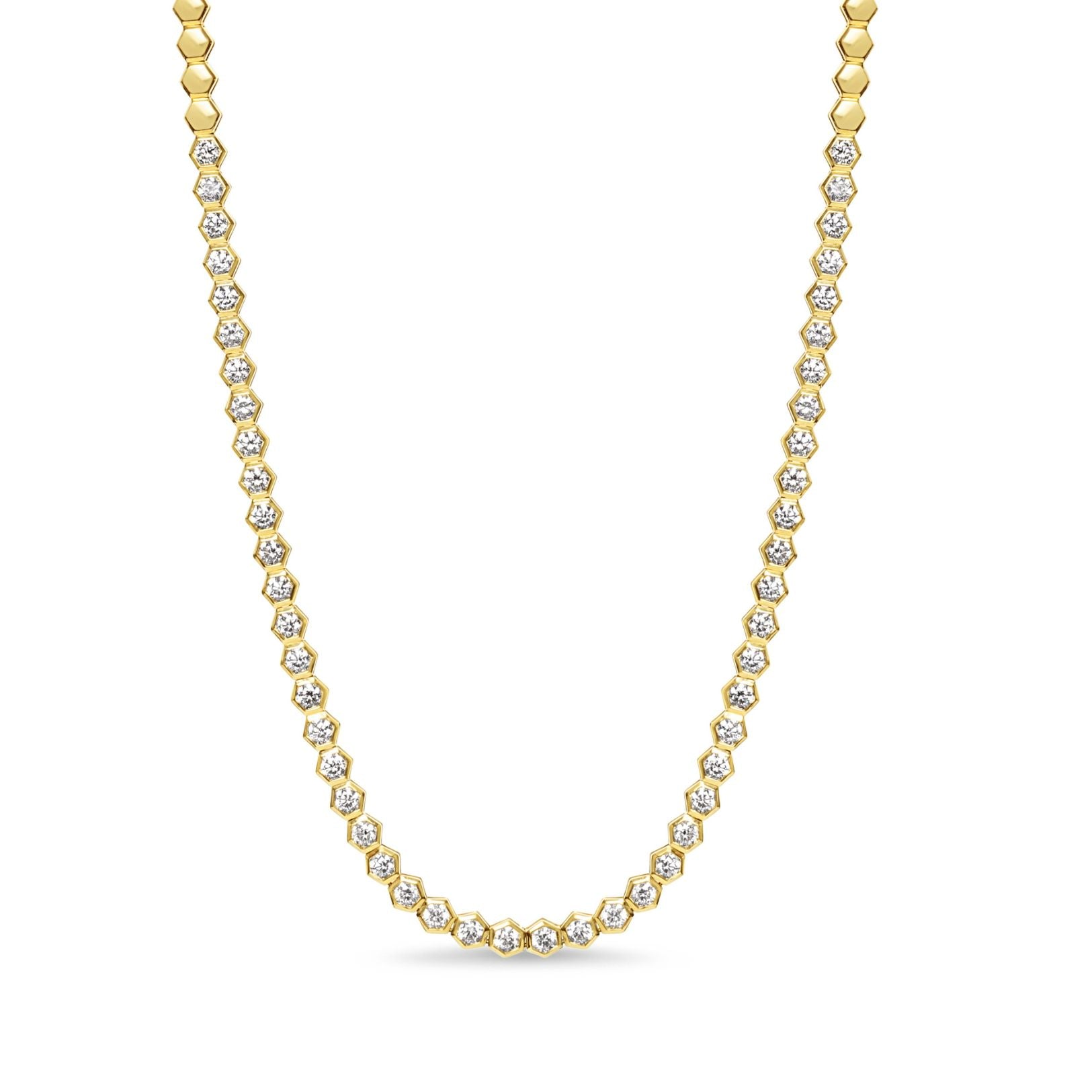 A bold update to a classic. This bezel-set tennis necklace features round diamonds framed in distinctive hexagon bezels, offering a modern take on the classic tennis necklace. It's a forever favorite.