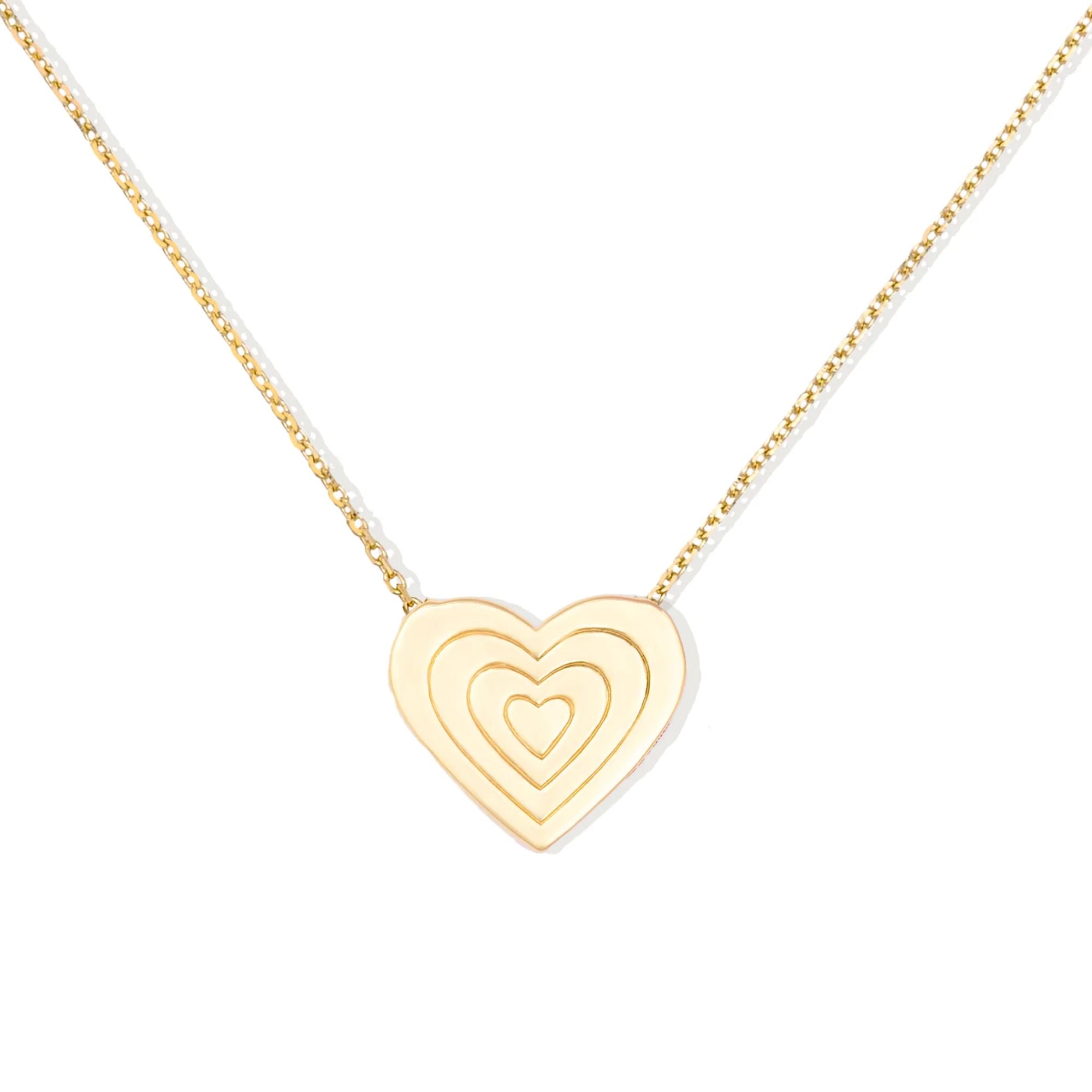 Full of whimsy, the Juju Heart Charm Necklace features a ruby and pink sapphire heart-shaped charm. Hanging from a 14k gold diamond cut cable chain, and part of the highly collectible Juju Collection, each charm features signature ribbing detail and the same gold design on the back.