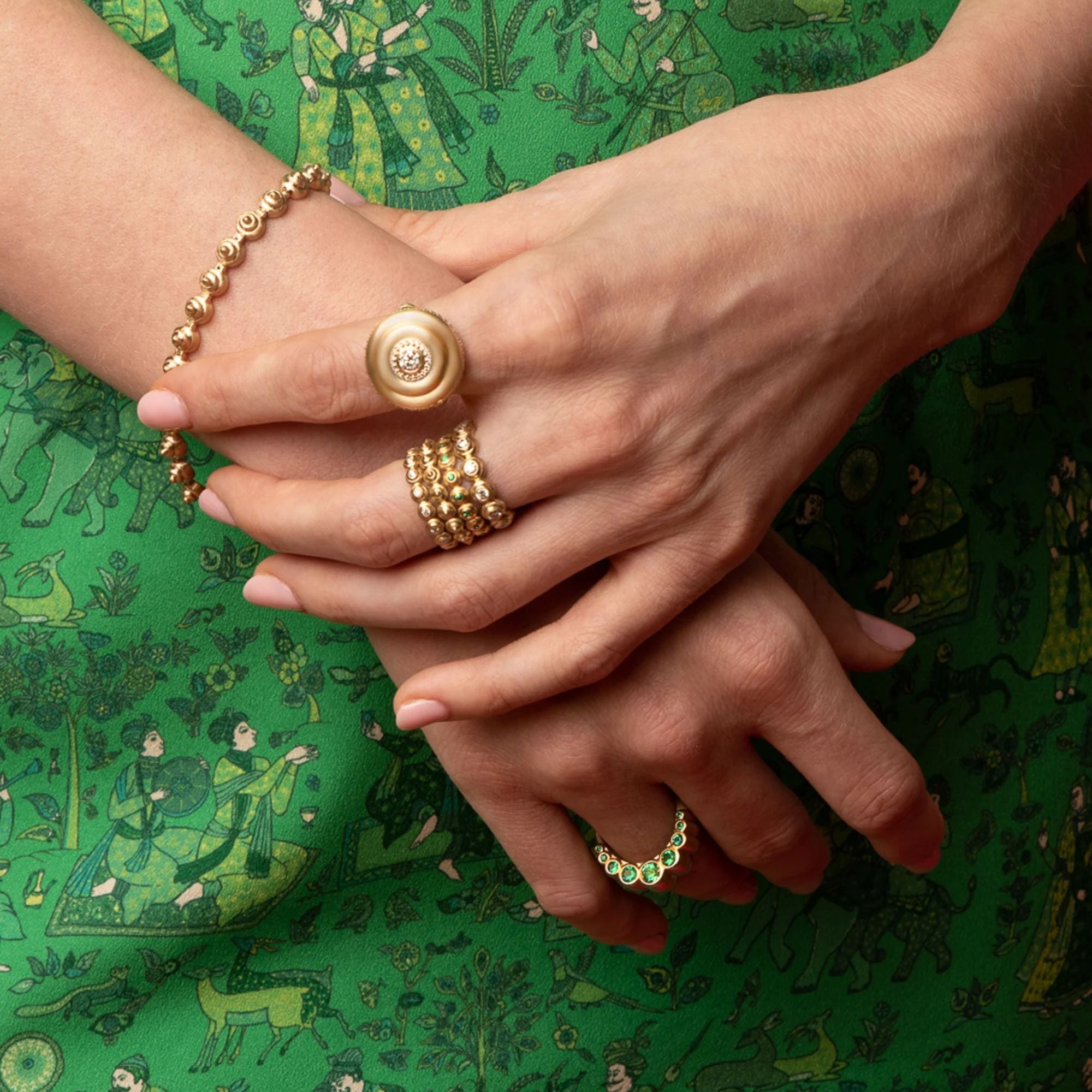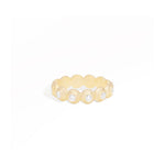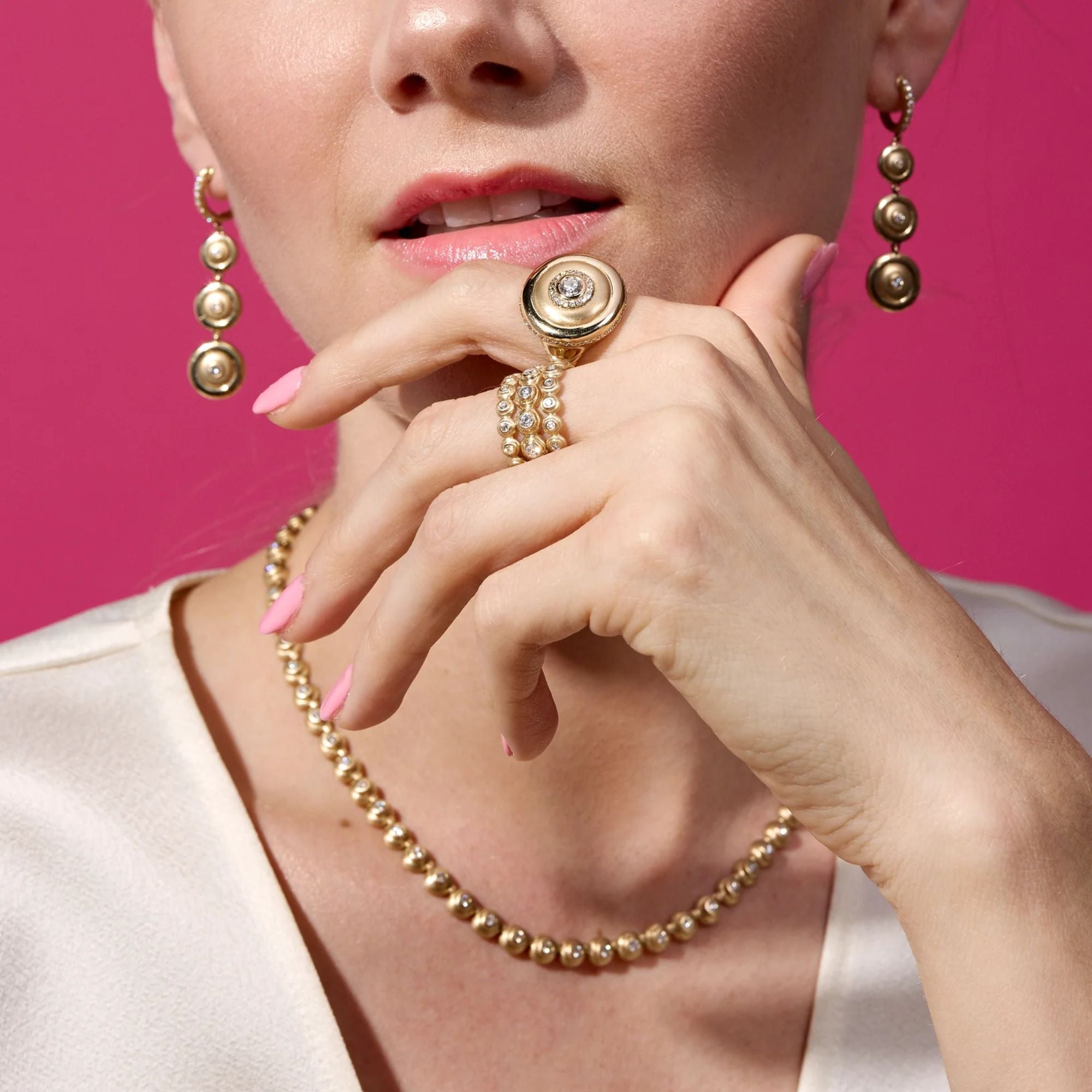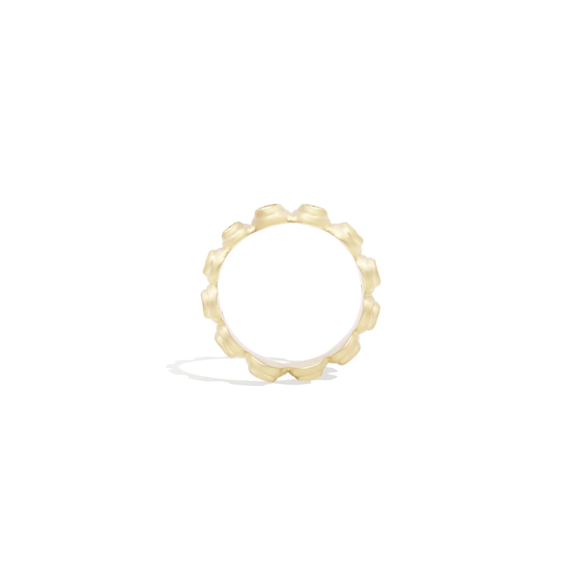 The repeating concentric circle design forming the Evolve Stacking Ring symbolizes the cyclical process of constantly evolving to be our best selves. Each 14k gold concentric circle component centers on a diamond, creating a uniquely designed band that is both, textural and radiant.
