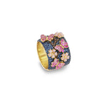 A bold yet refined statement ring with playful, natural energy. Crafted in 18k yellow gold, this wide cigar band is set with a mix of blue diamonds, pink sapphires, white diamonds, & smoky quartz for a lively garden-inspired palette. The vibrant gemstone arrangement and subtle pavé details bring a sense of movement and charm to a classic silhouette—perfect for stacking or wearing solo. Handmade in NYC.