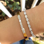 Crafted in 18K yellow gold with emerald-cut diamonds, this oval-shaped bracelet contours elegantly to the wrist. A striking piece for any occasion.