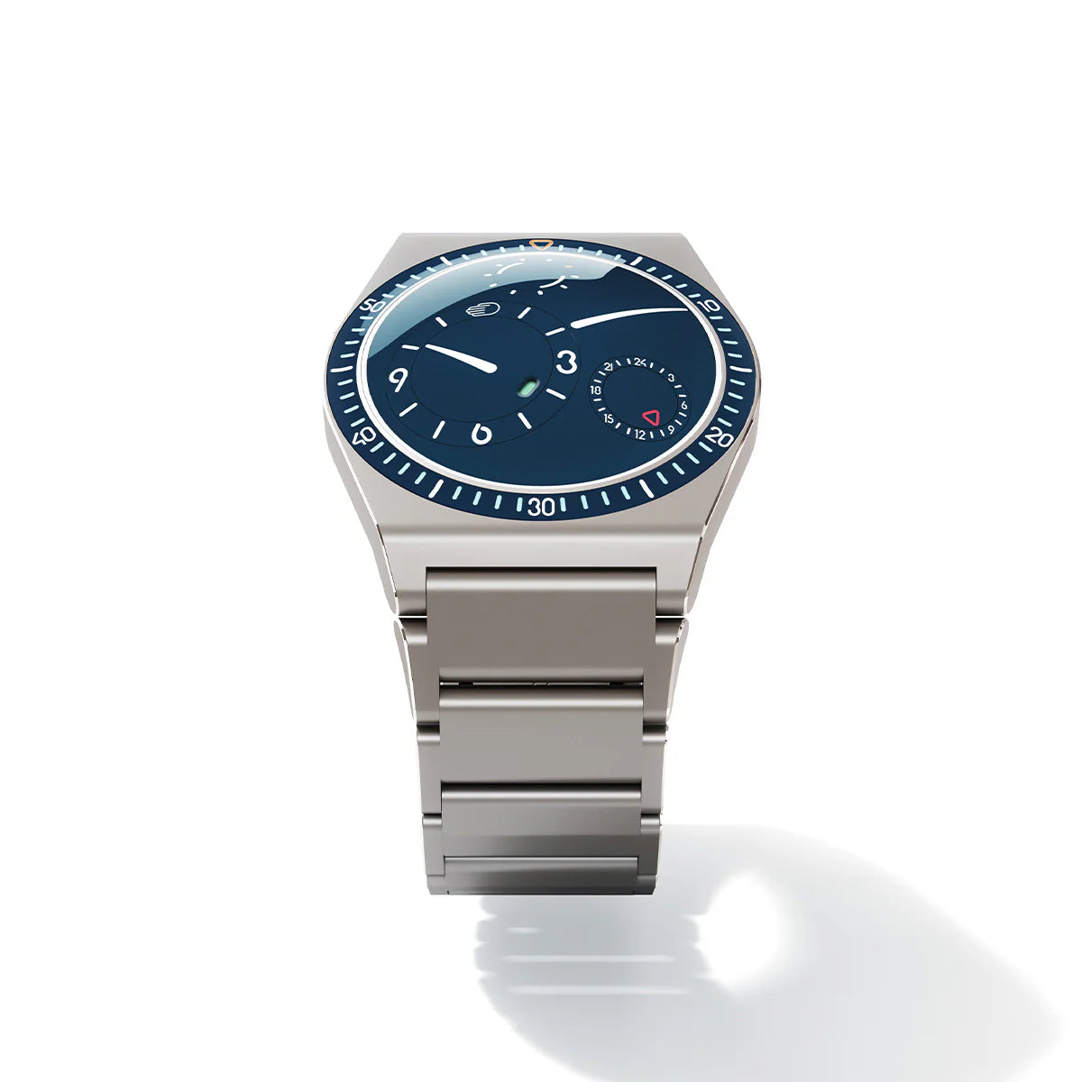 - Convex Grade 5 titanium dial (75 diameter) with three eccentric biaxial satellites inclined at 9.75° (hours and t°) and 18" (runner and GMT)