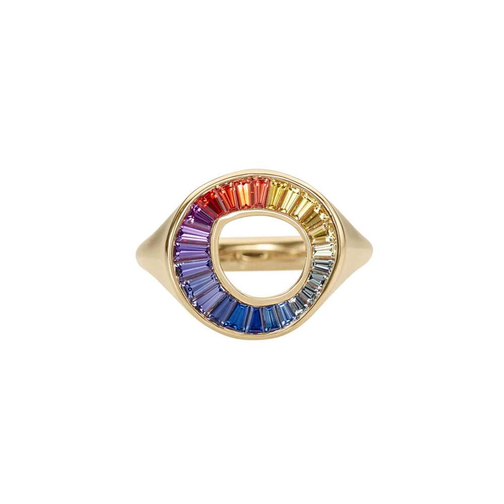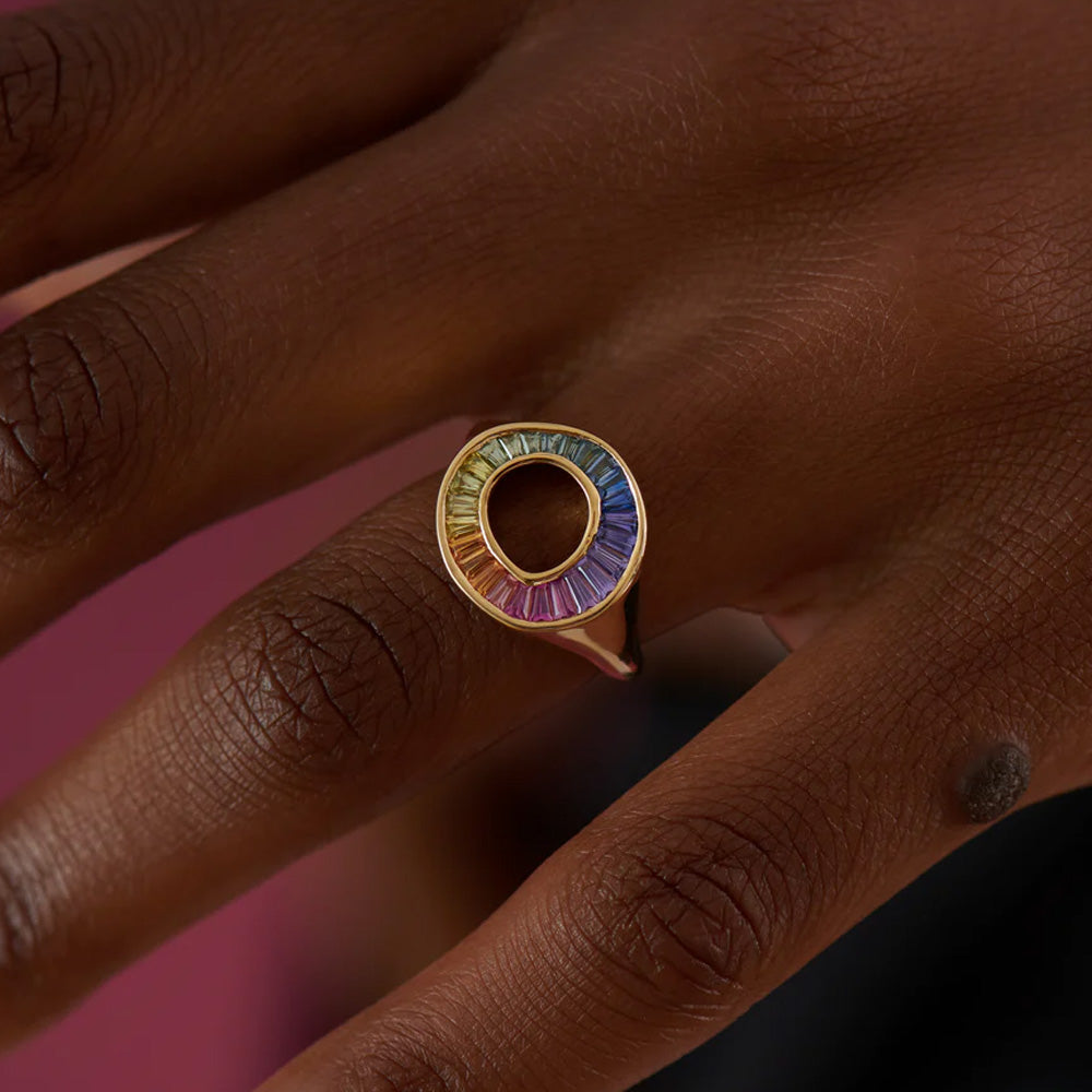 Elevate your jewelry collection with our exquisite rainbow sapphire baguette sphere ring, a unique masterpiece crafted from luxurious 18-karat gold and custom-cut sapphires. The organic shape of this ring beautifully showcases the kaleidoscopic hues of the sapphires, creating a vibrant and colorful statement piece. With a total sapphire carat weight of 1ct and a band width of 2.5mm, this ring is a true work of art that will add a touch of elegance and sophistication to any ensemble.