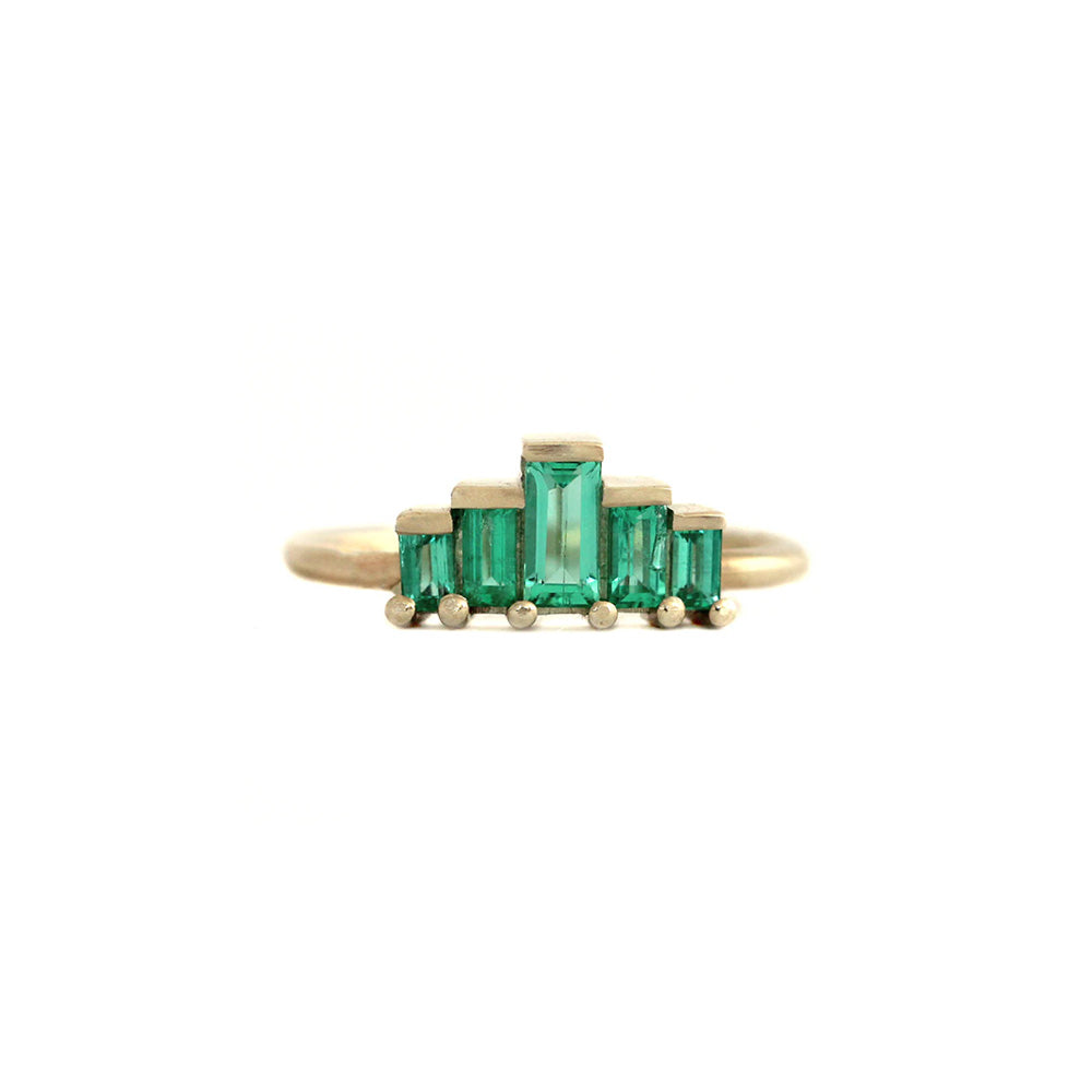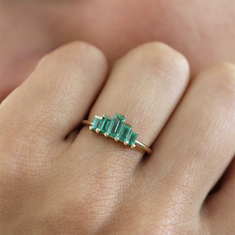 Adorn your finger with this exquisite emerald engagement ring, crafted from luxurious 18kt solid yellow gold. The art deco-inspired design features five baguette cut emeralds in varying sizes, totaling 0.6 carats. The sleek lines and geometric shapes of this ring exude elegance and sophistication, making it a perfect choice for those who appreciate timeless beauty and glamour.