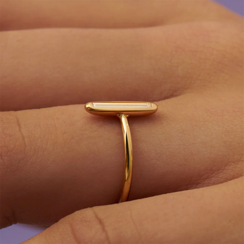 Elevate your style with the Dial baguette diamond engagement ring, meticulously handcrafted in our studio. The stunning baguette cut diamond is elegantly set in a rounded pillow setting, exuding a modern and timeless appeal that complements any collection effortlessly. This exquisite ring features a 1.5mm band width and boasts a 18k solid gold construction, showcasing a baguette cut diamond with very good-excellent cut, VS clarity, color E-G, and conflict-free origins.