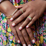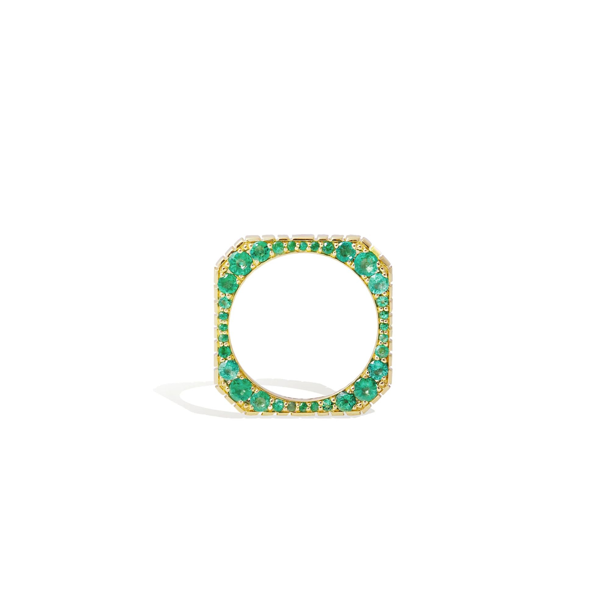 The Spark Side Stone Etched Stacking Ring Band delivers unexpected and unique design elements on all surfaces of this ring. Both sides are covered in striking emeralds and the top features signature etching details. This geometric design is an elevated take on the classic stacking band.
