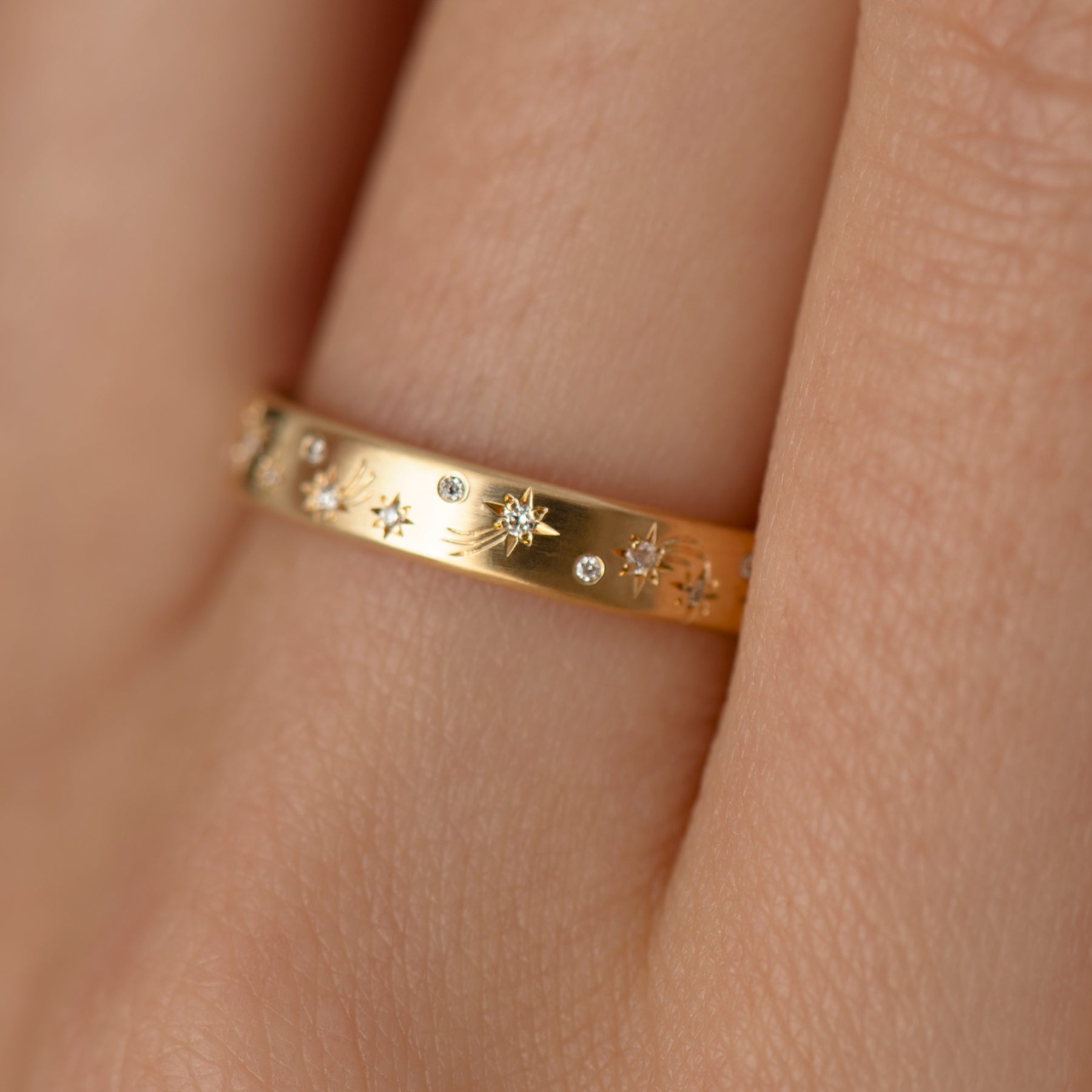 Make a wish with the Diamond Shooting Star Band. Handcrafted in our studio from 18K matte finish gold, this whimsical design features engraved shooting stars accented by sparkling diamonds. Whether worn as a wedding band or as part of your daily stack, it brings a dreamy, celestial touch to any collection.