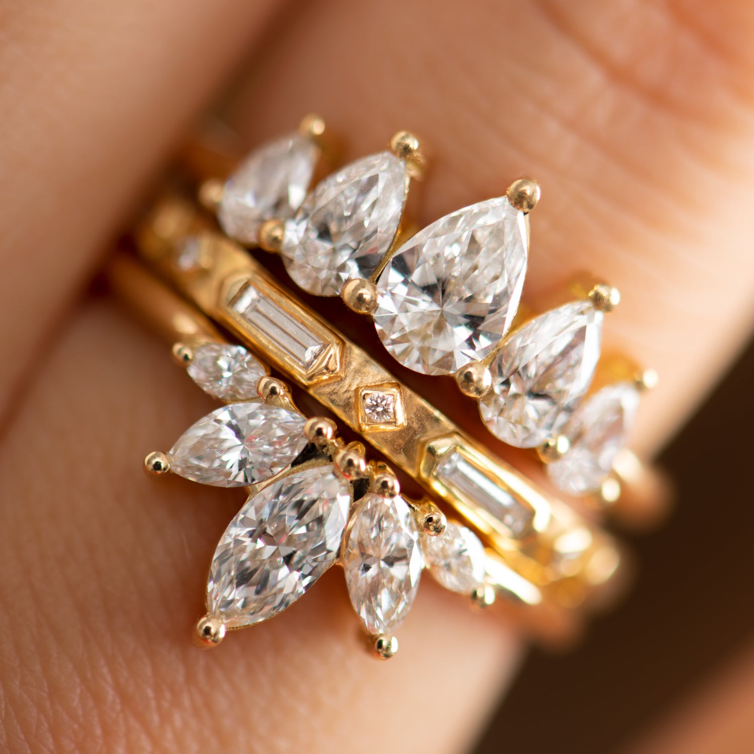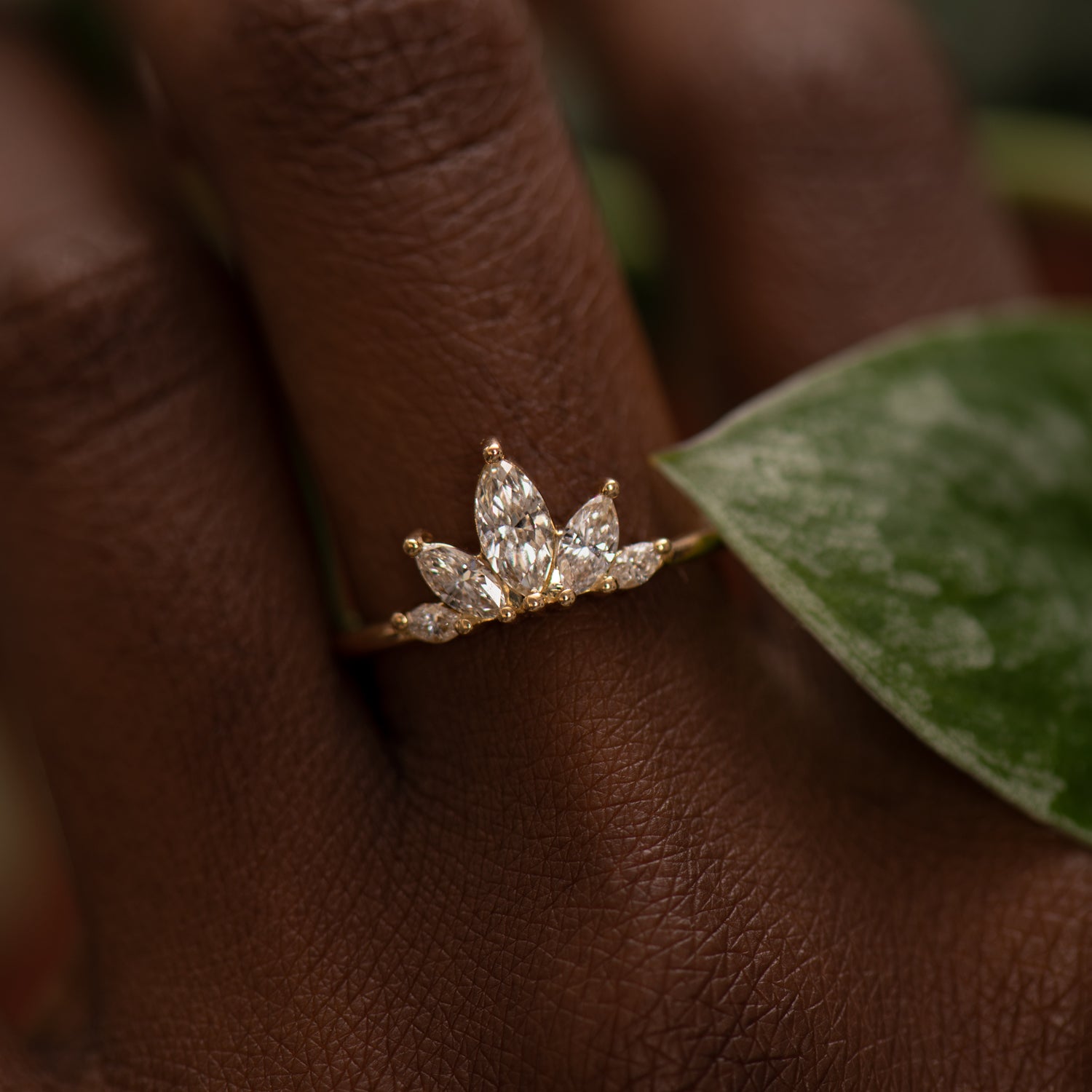 The Petal Ring with Marquise Cut Diamonds is a graceful addition to any wedding set. Five marquise diamonds fan out from the band in a floral-inspired silhouette, offering a soft, sculptural sparkle.