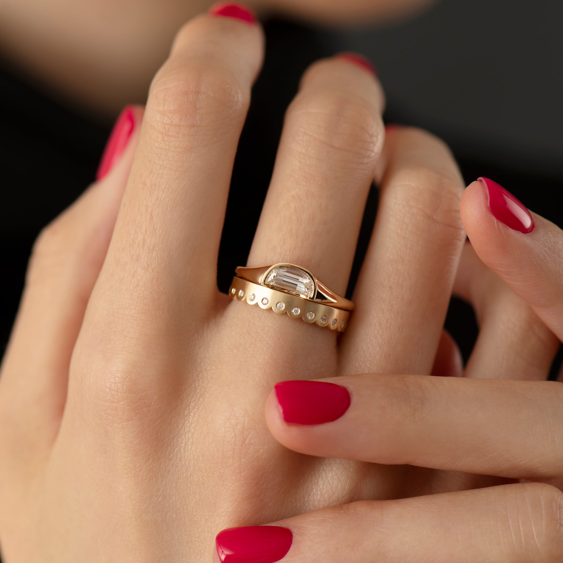 Handcrafted in 18K gold, this eternity band features brilliant white diamonds nestled along softly scalloped edges. The matte finish adds a modern contrast to the delicate sparkle, making it a striking choice whether worn solo or stacked.