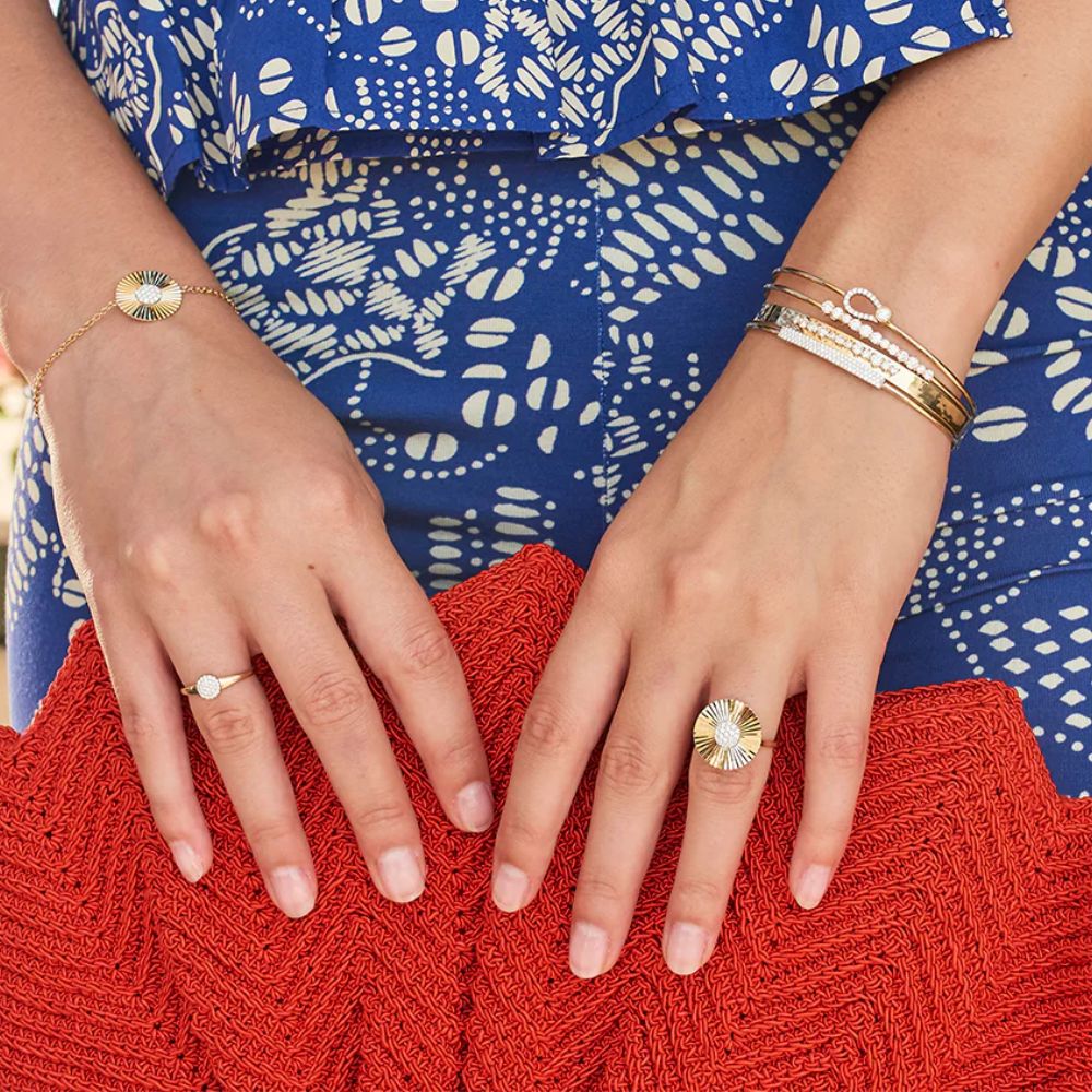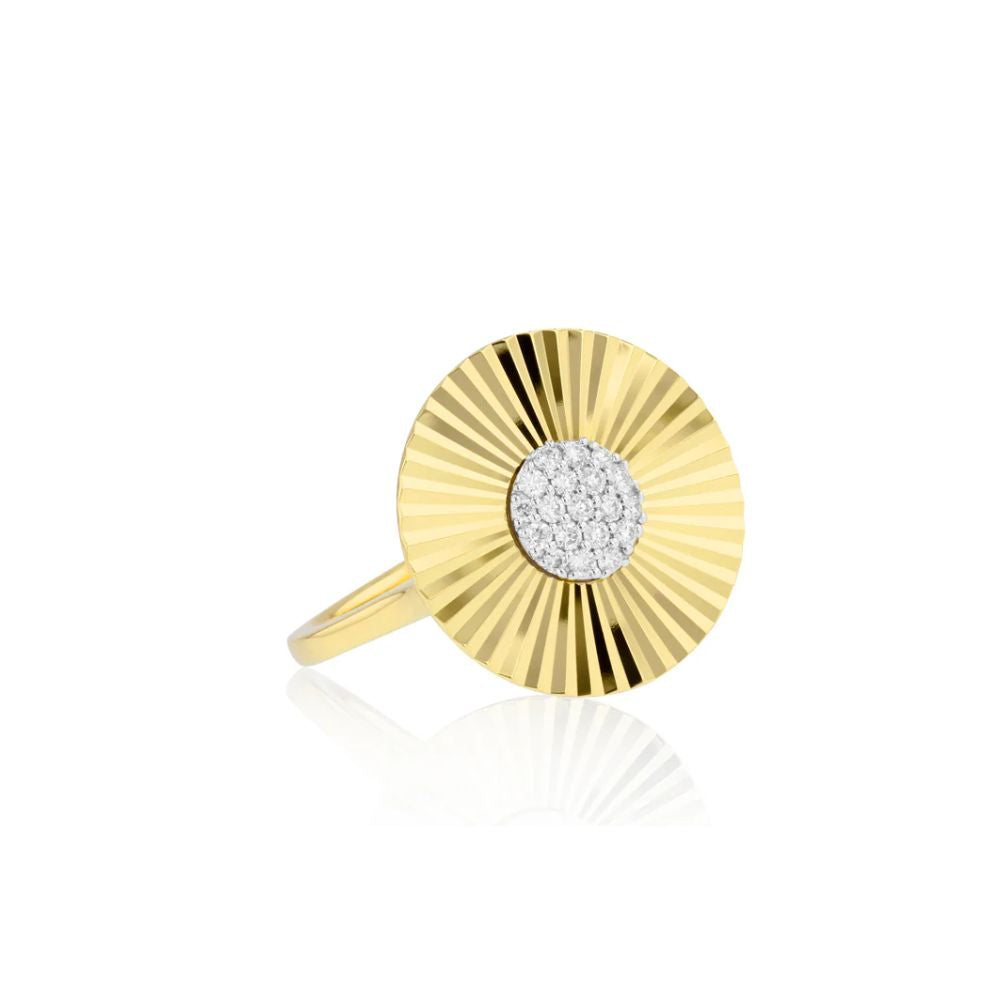 An eye-catching ring featuring our signature Aura disc and diamond pavé. Aura is meant to convey the energy that irradiates around you, the reflection of gold combined with the sparkle from the diamond creates the perfect amount of sparkle.