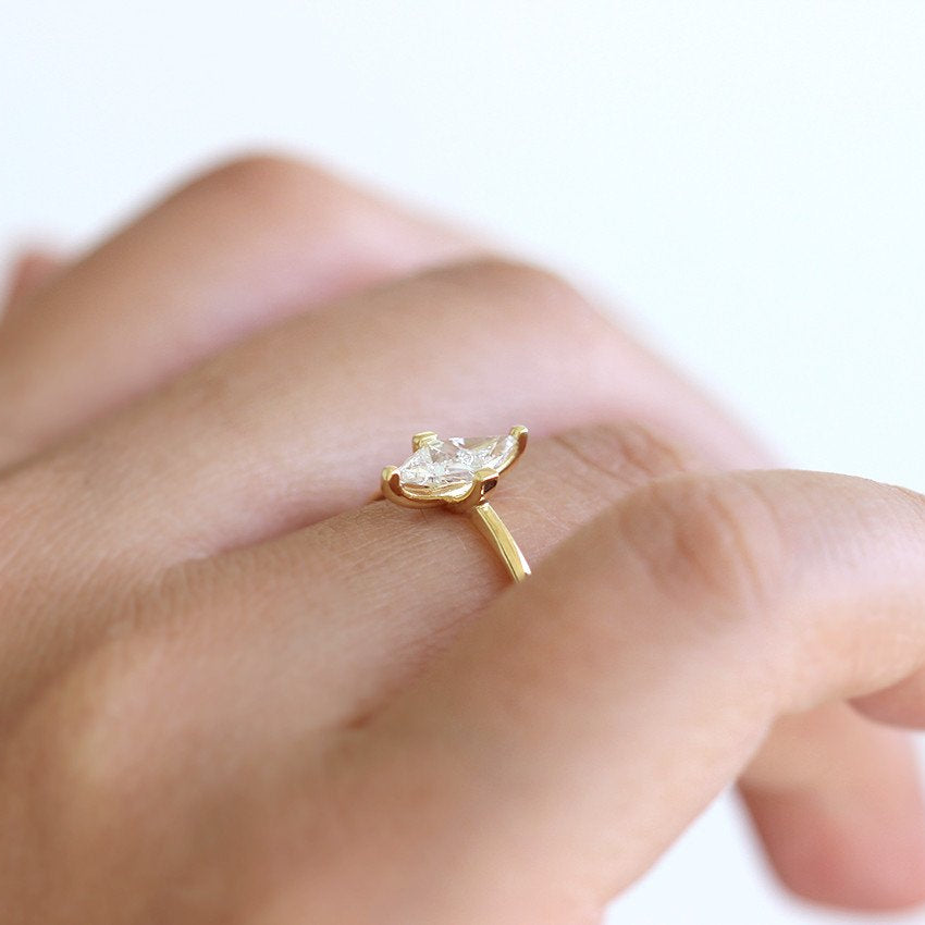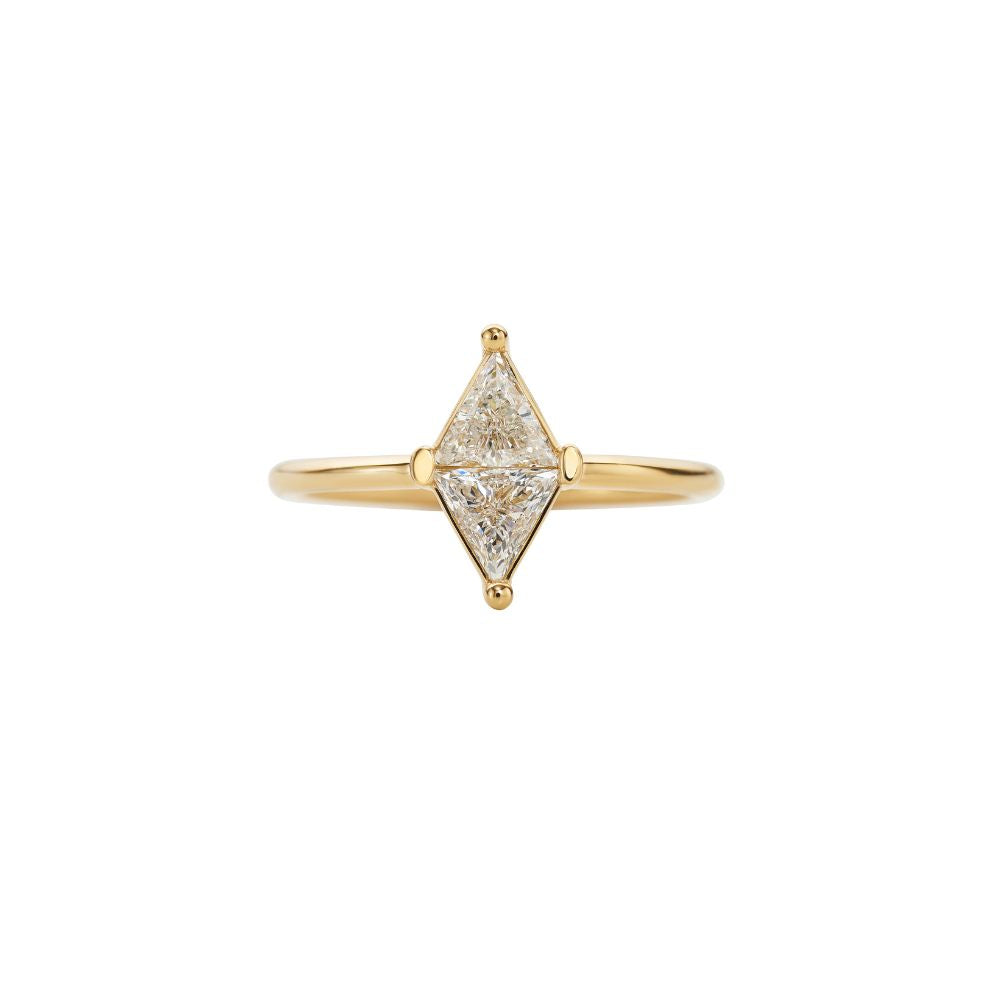 A study in symmetry and simplicity, the Rhombus Diamond Ring features two expertly matched trillion cut diamonds joined to form a clean geometric silhouette. Set in 18k solid gold, this refined design feels quietly bold—delicate in scale, yet striking in shape.